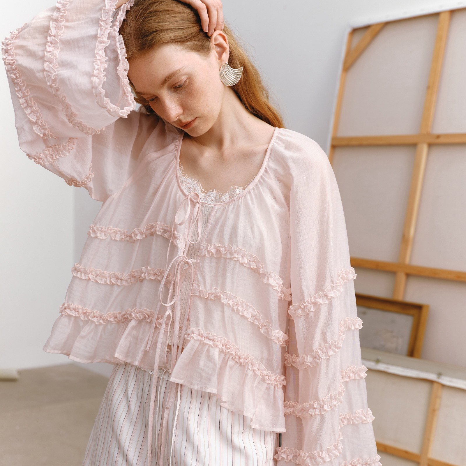 wana try木耳边仙女飘逸透视薄开衫2026早春新品温柔女款长袖上衣