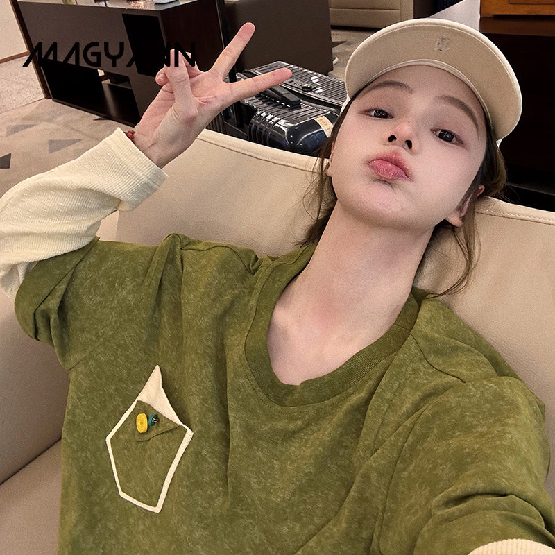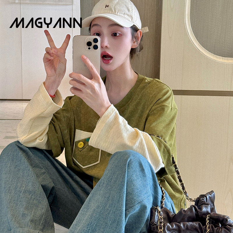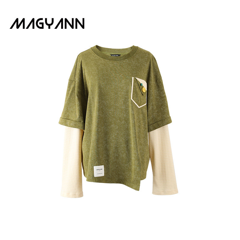 【苔花】Magyann设计师原创2026春圆领休闲撞色假两件拼接长袖T恤