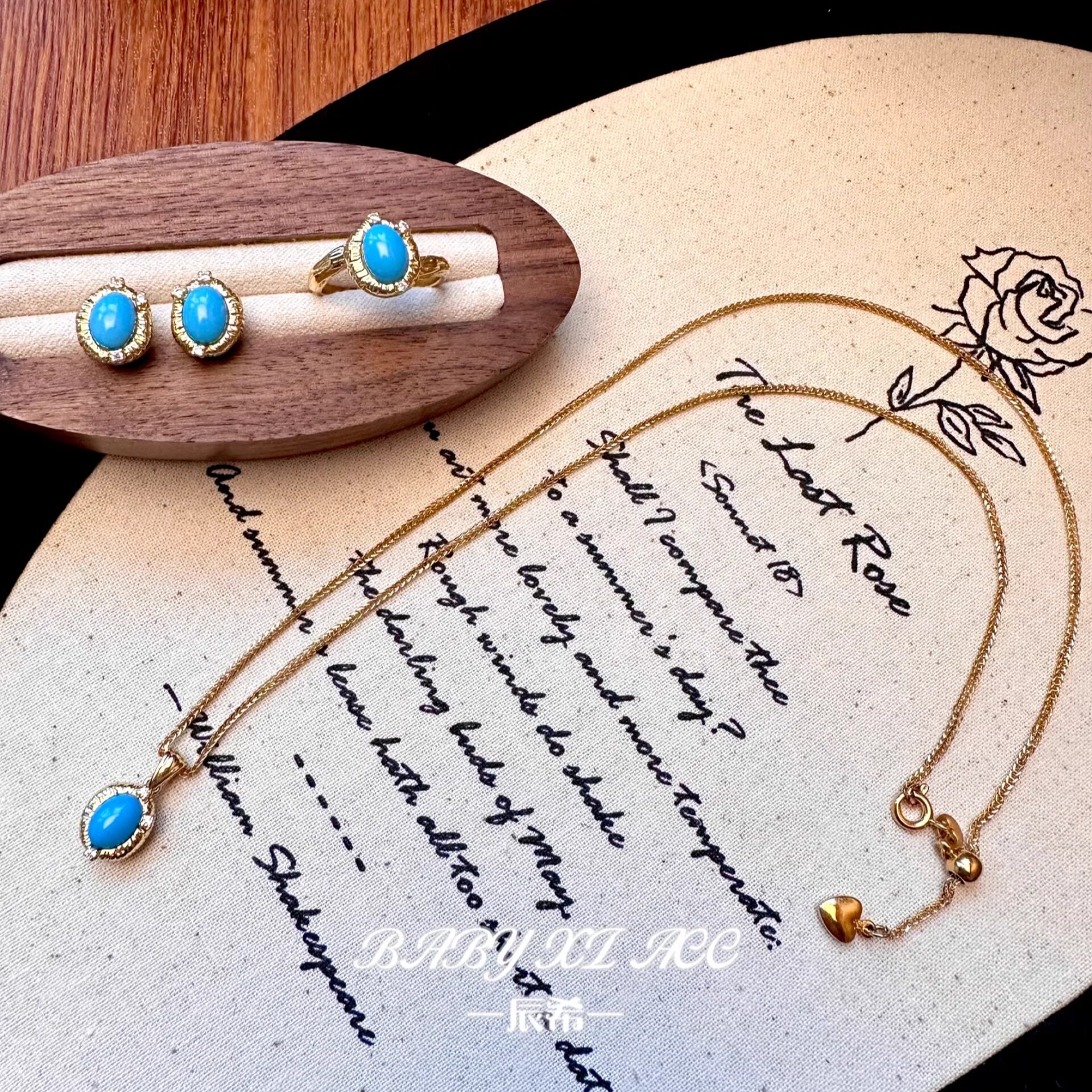 「睡美人」天然石绿松石锆石镶嵌高级简约设计项链戒指耳钉 X038