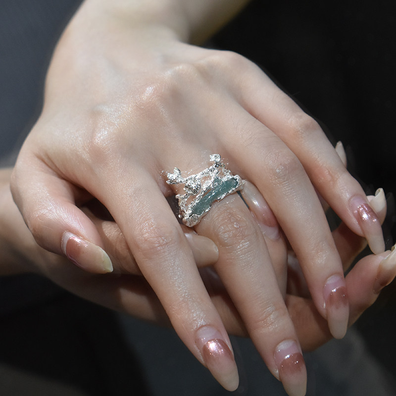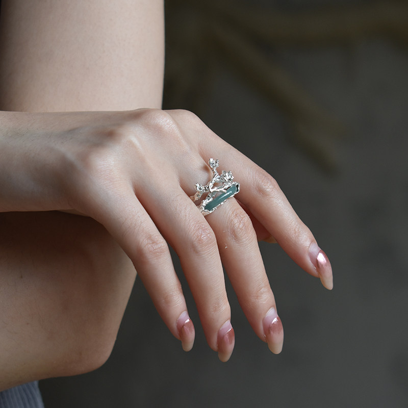東黑三白/白梅青 s93纯银小众花型原创设计感镶嵌玉开口戒指礼物