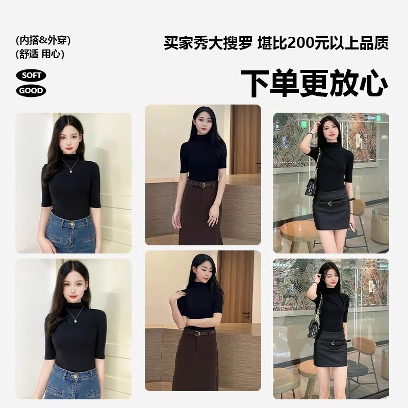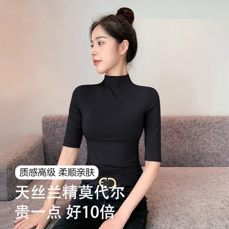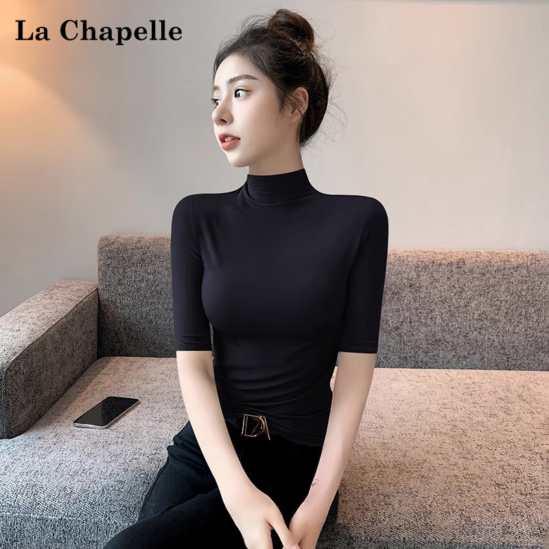 拉夏贝尔莫代尔半高领中袖T恤女内搭春夏黑色修身五分袖打底衫潮