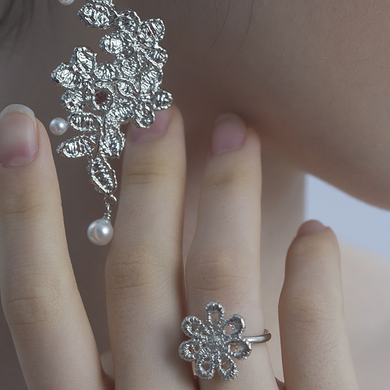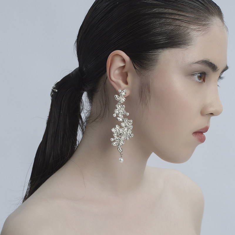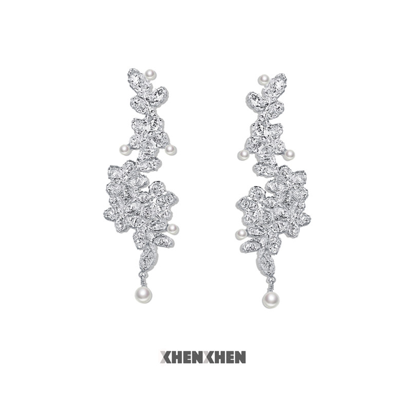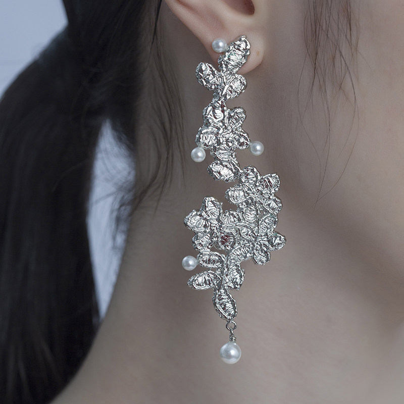 XHENXHEN小蕾丝系列珍珠造型个性合金银色长耳环高级感原创设计