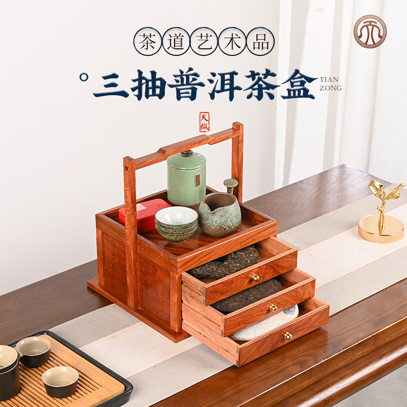 天纵缅甸花梨外独三抽提t篮红木中式茶桌面收纳盒实木普洱茶盒