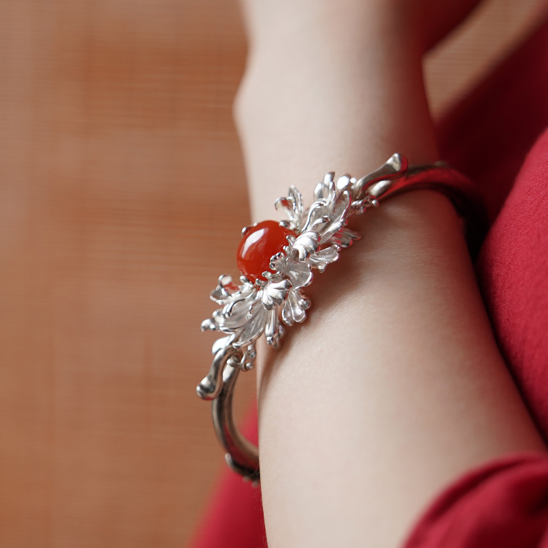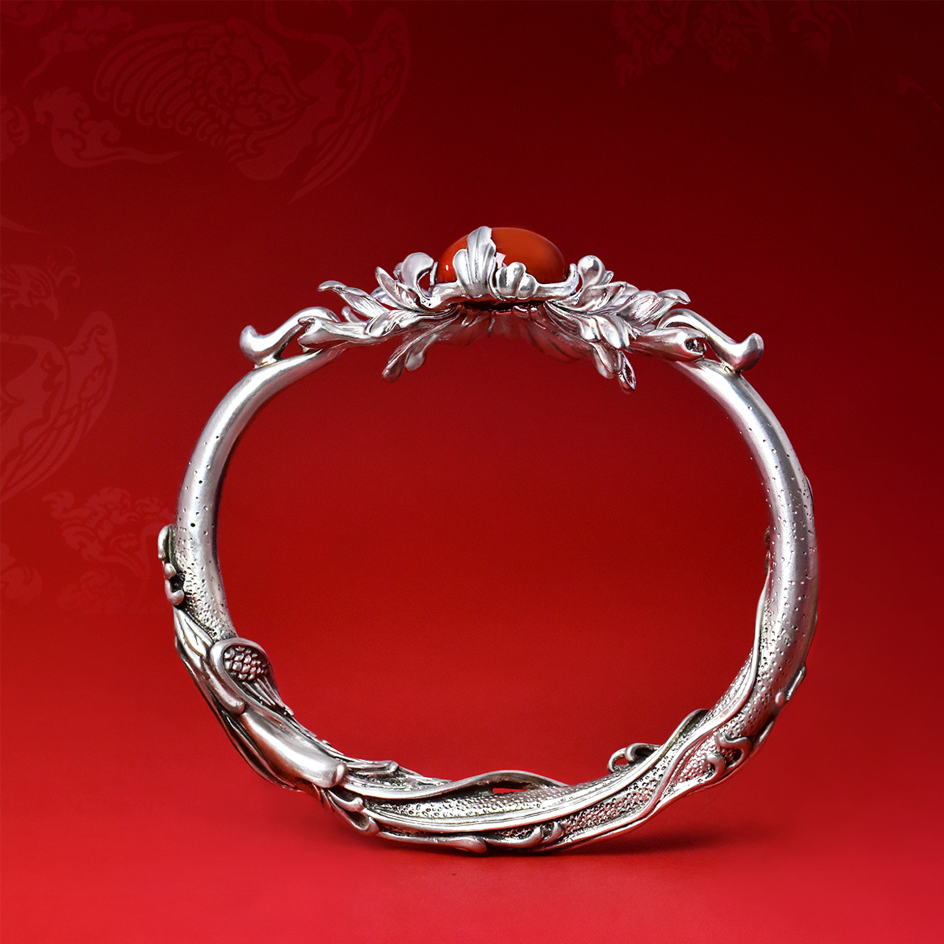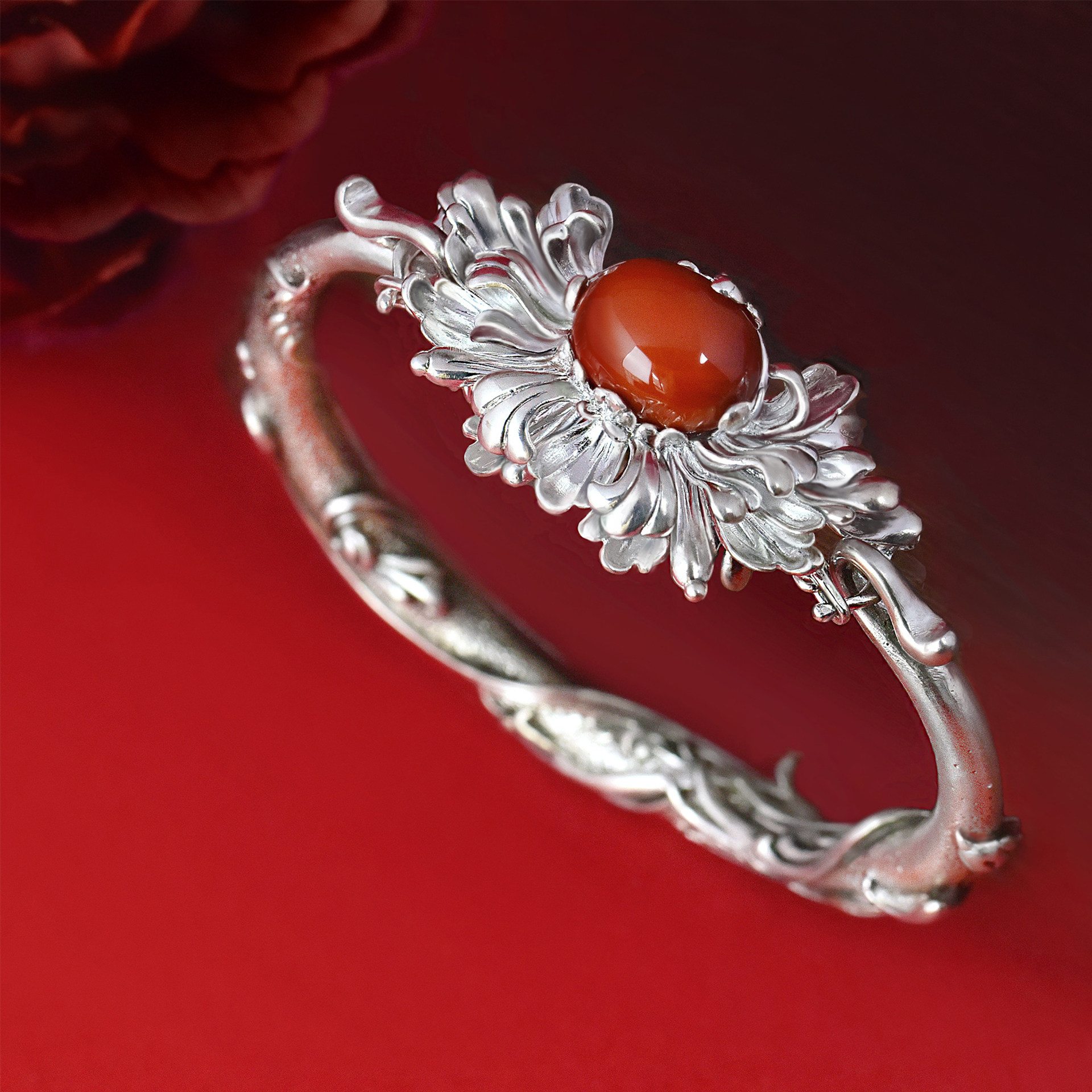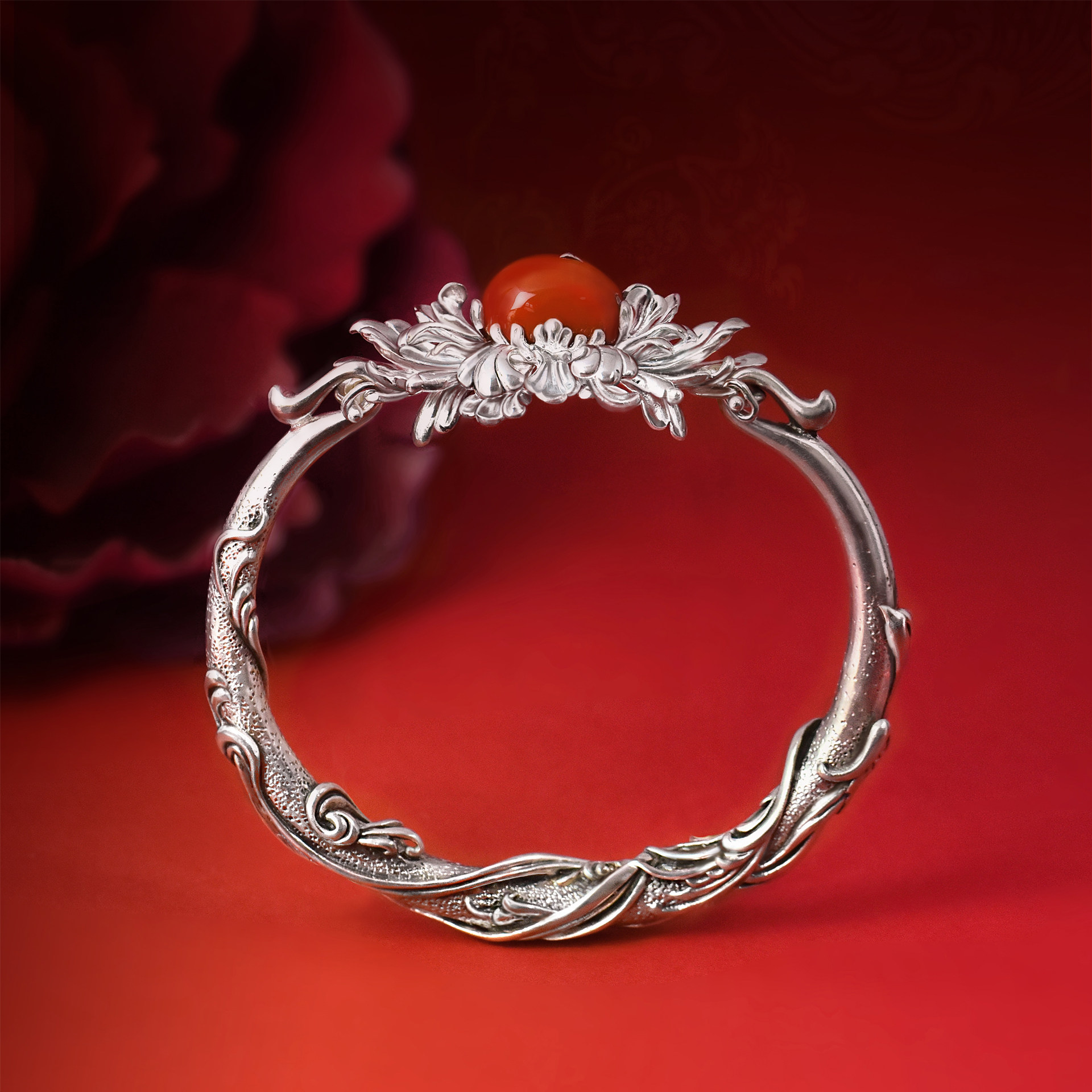 《凤穿牡丹》九九倾城原创/镶嵌南红银手镯古典重工精细足银手镯