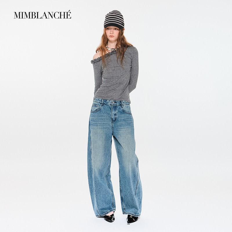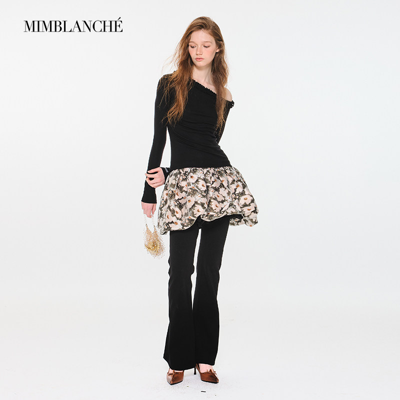 MIMBLANCHE天丝羊毛木耳边斜肩修身打底衫T恤女