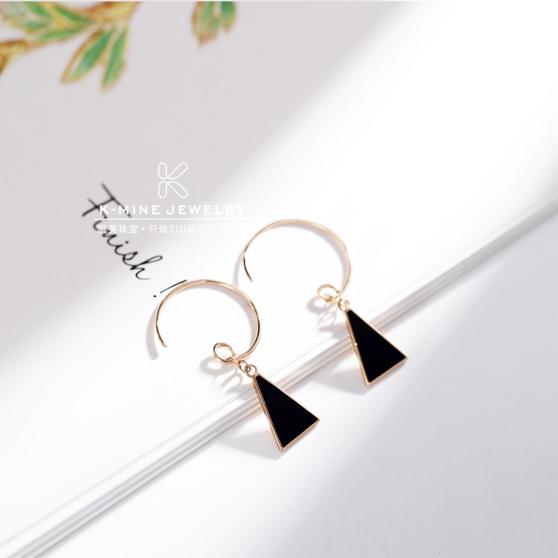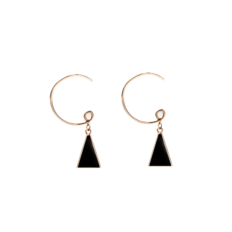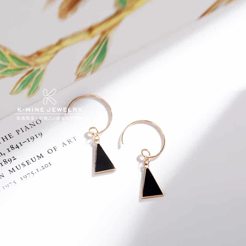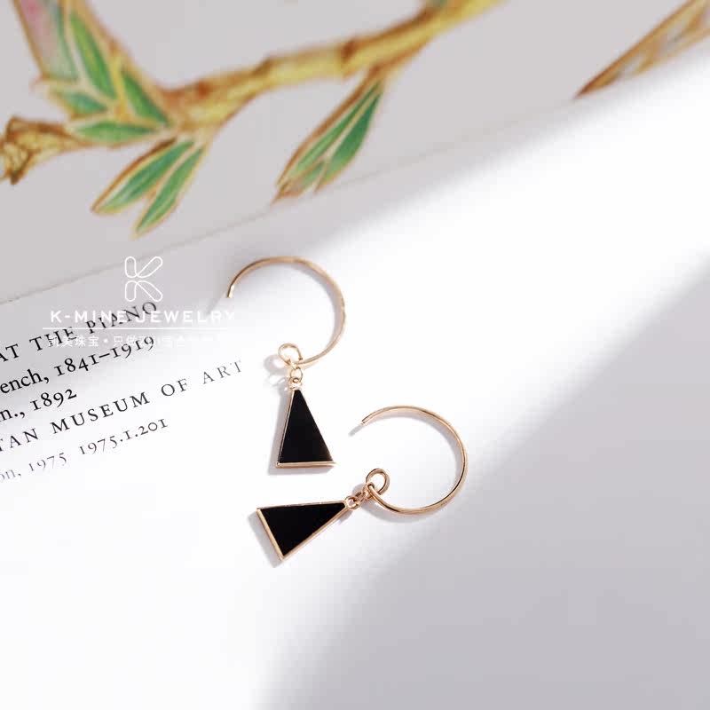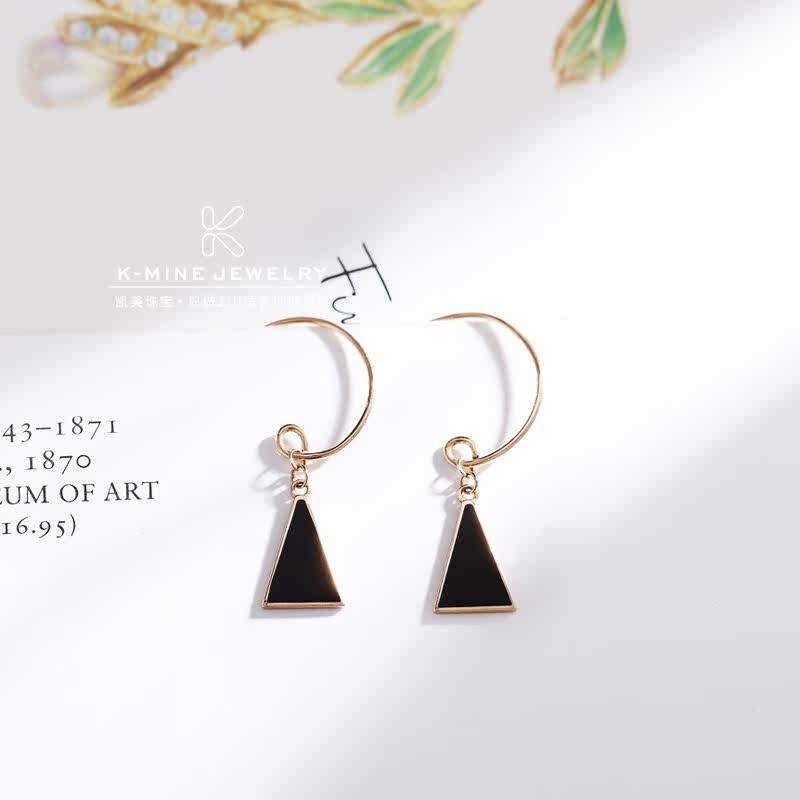 18K玫瑰金彩金耳环时尚几何三角形个性耳挂au750纯黑色简约耳饰女