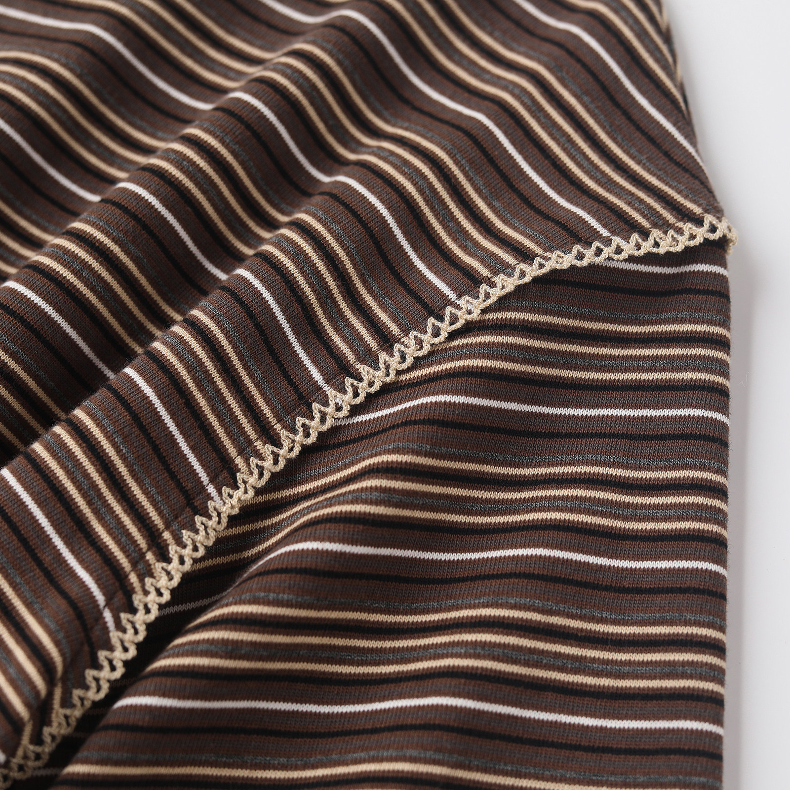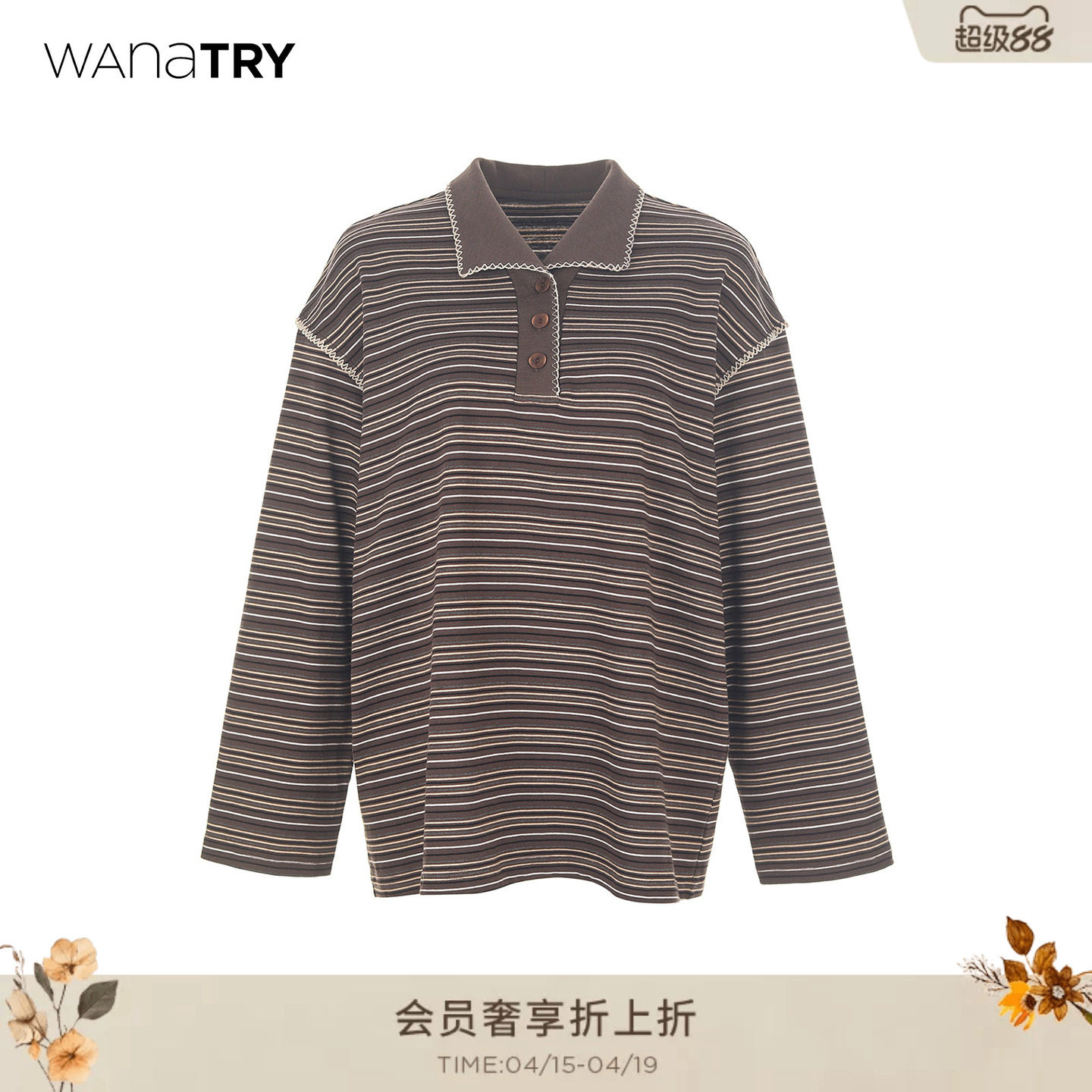 wana try条纹复古钩边polo咖色长袖上衣2025秋季新款宽松女款T恤