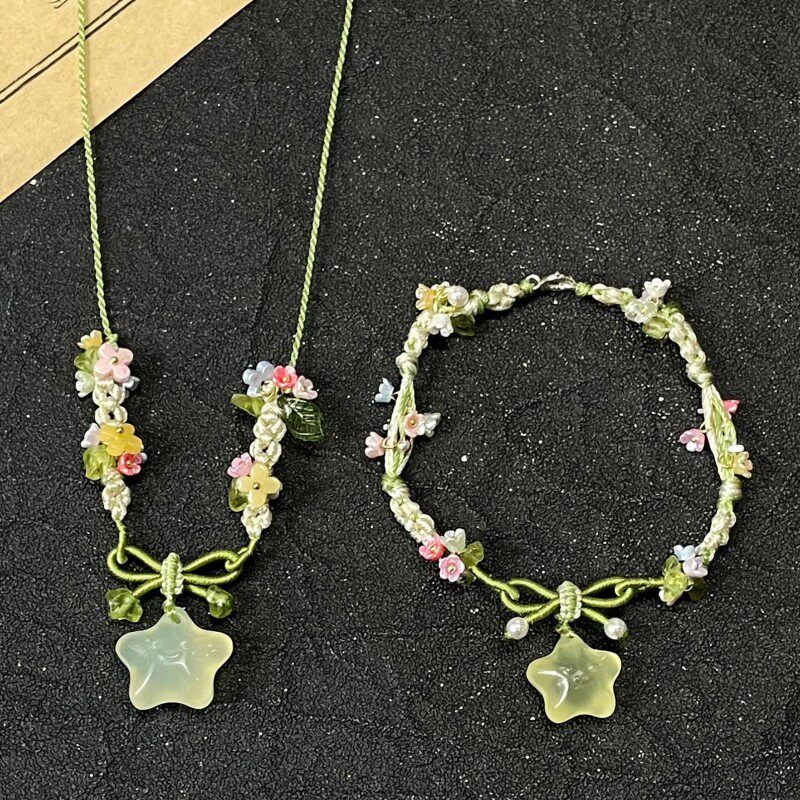 新中式高级夏天冰透小星星绿水晶五彩小花编织手绳百搭个性项链女