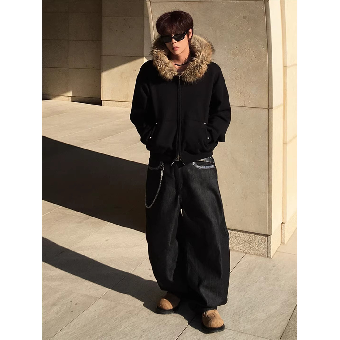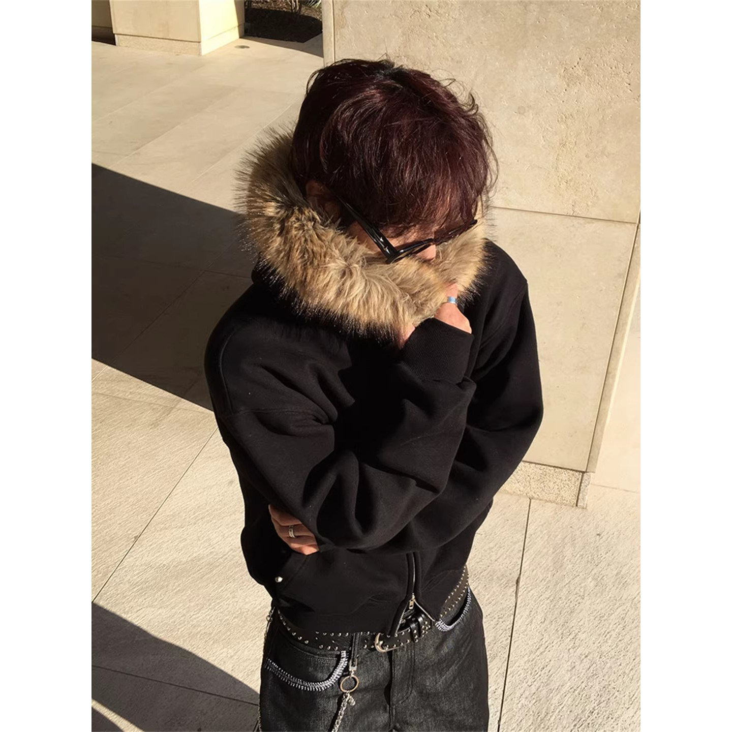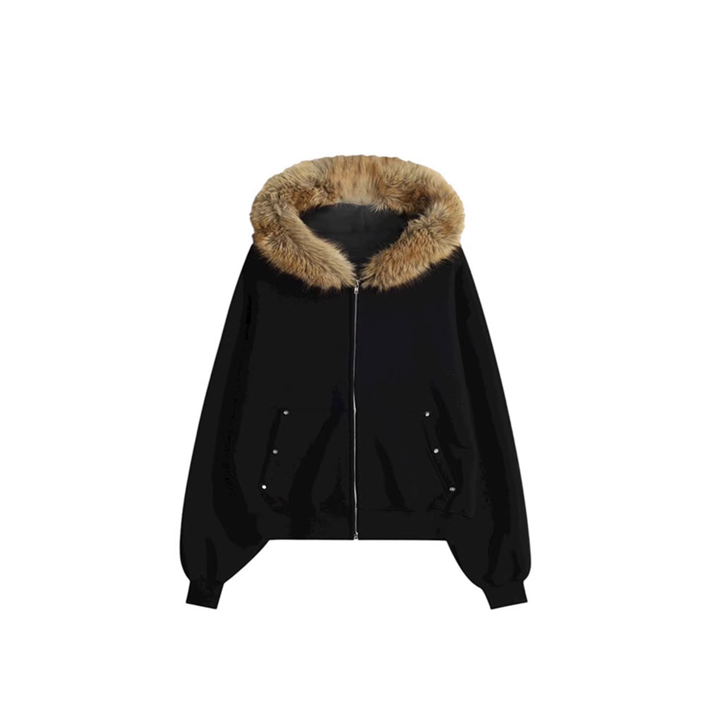 ANAN韩国东大门代购毛边加绒连帽拉链衫宽松版长袖中性款夹克外套