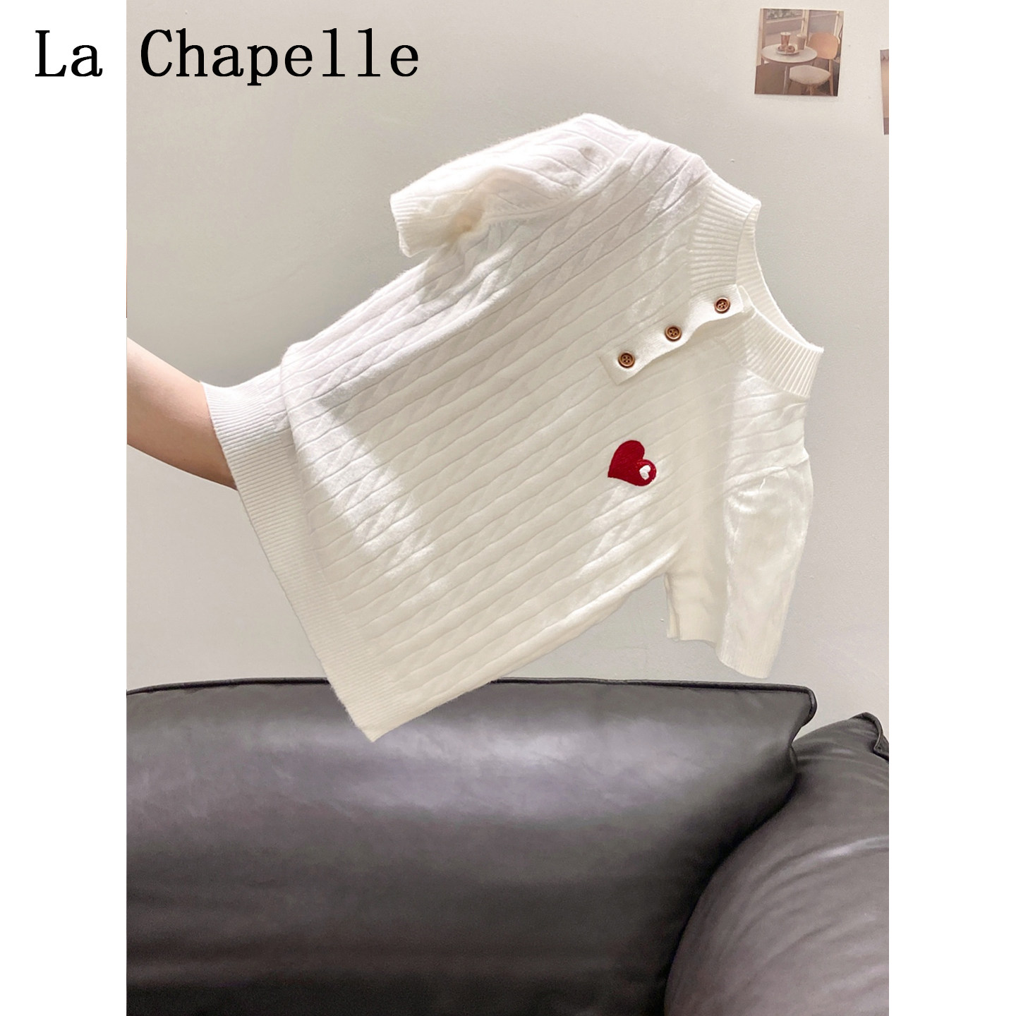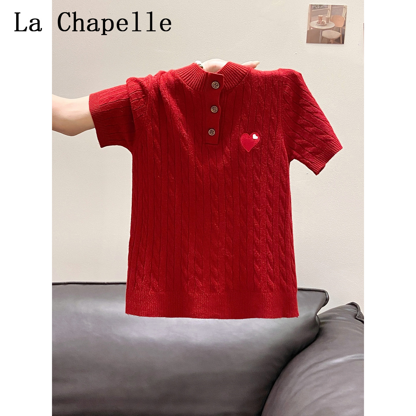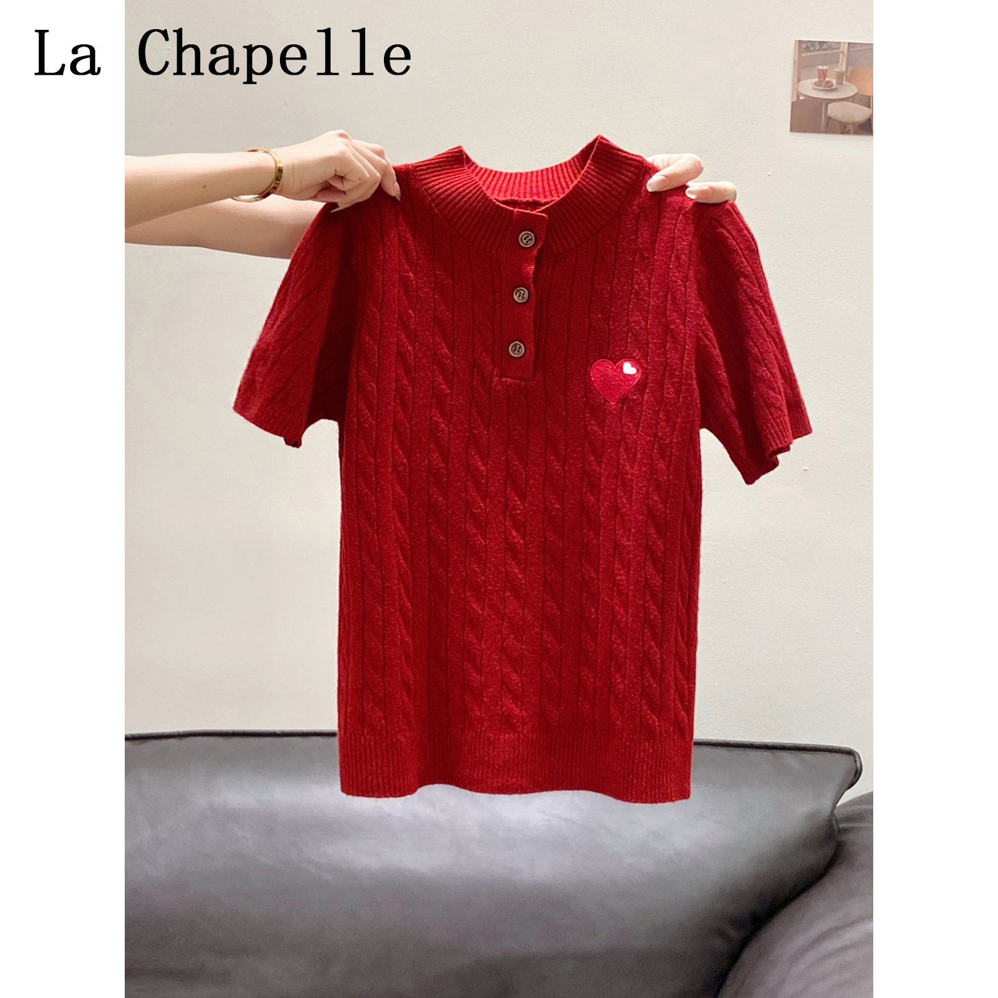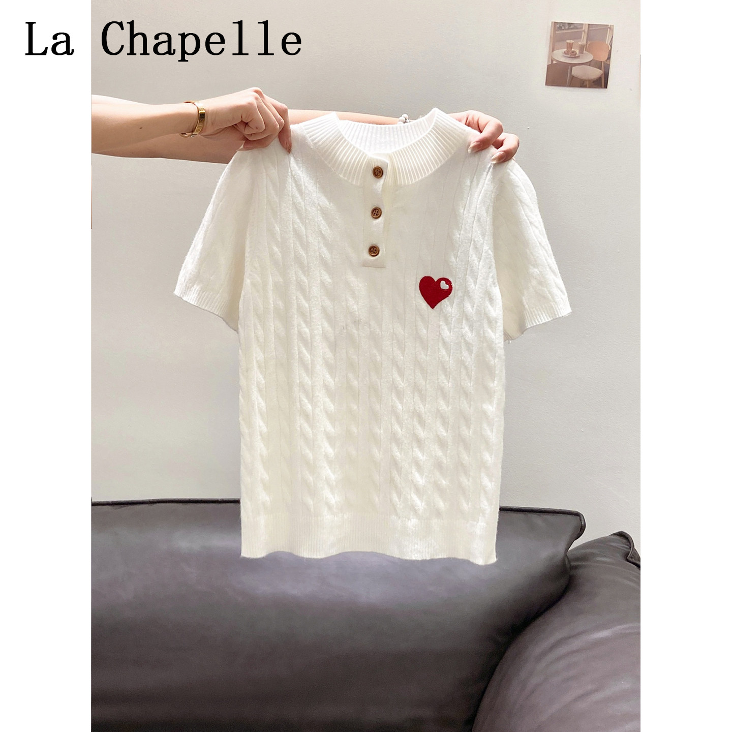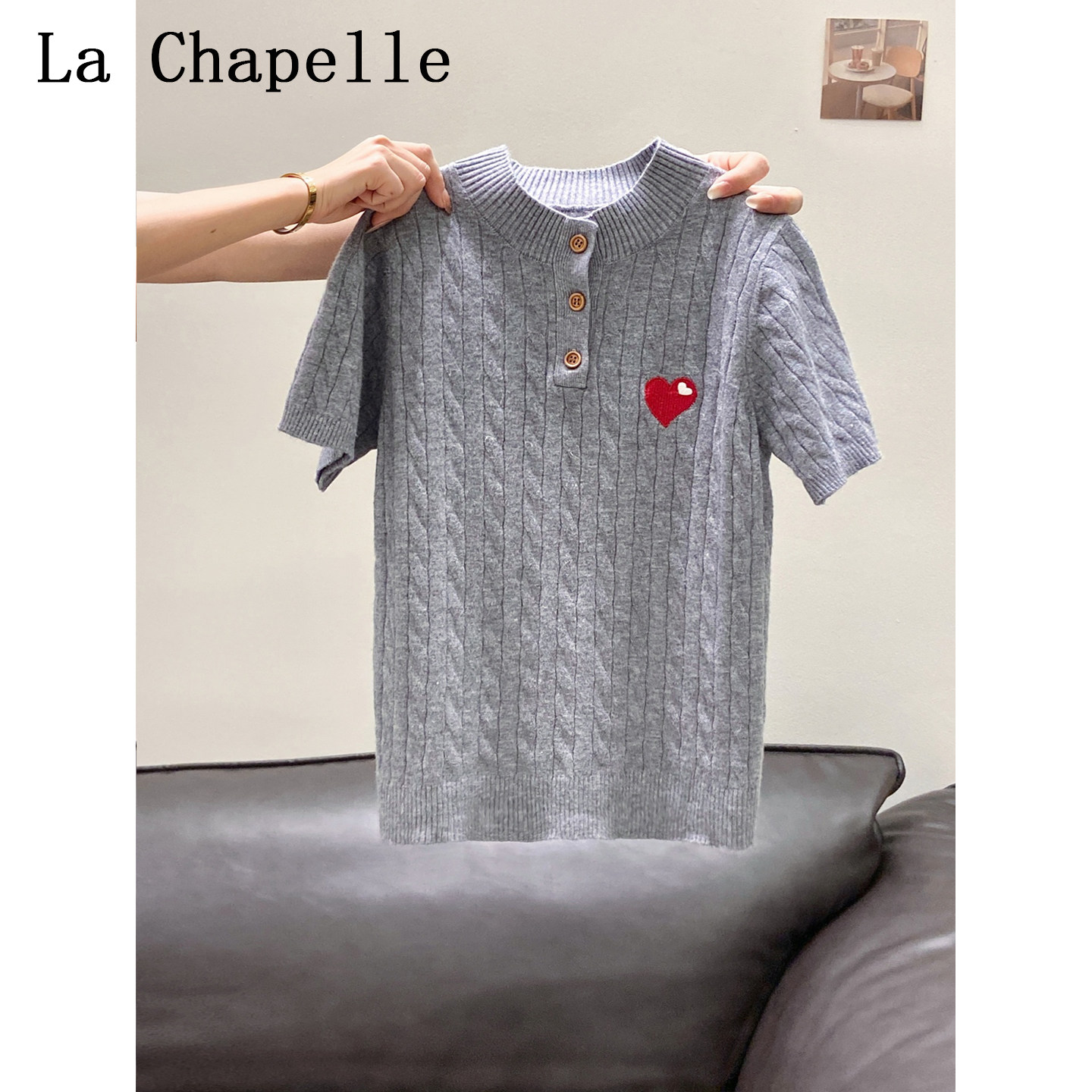 拉夏贝尔设计感爱心刺绣短袖针织打底衫女2026夏季新款正肩上衣潮