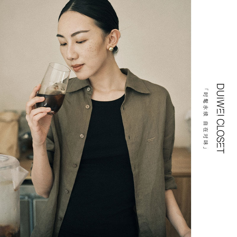 DUIWEI法国长纤亚麻浅蓝色微廓形墨镜刺绣防晒酷感衬衫女夏