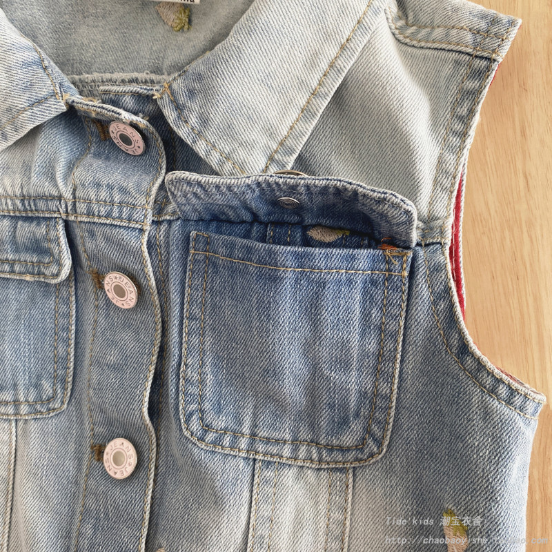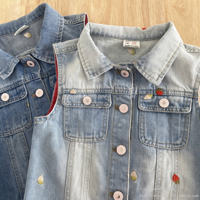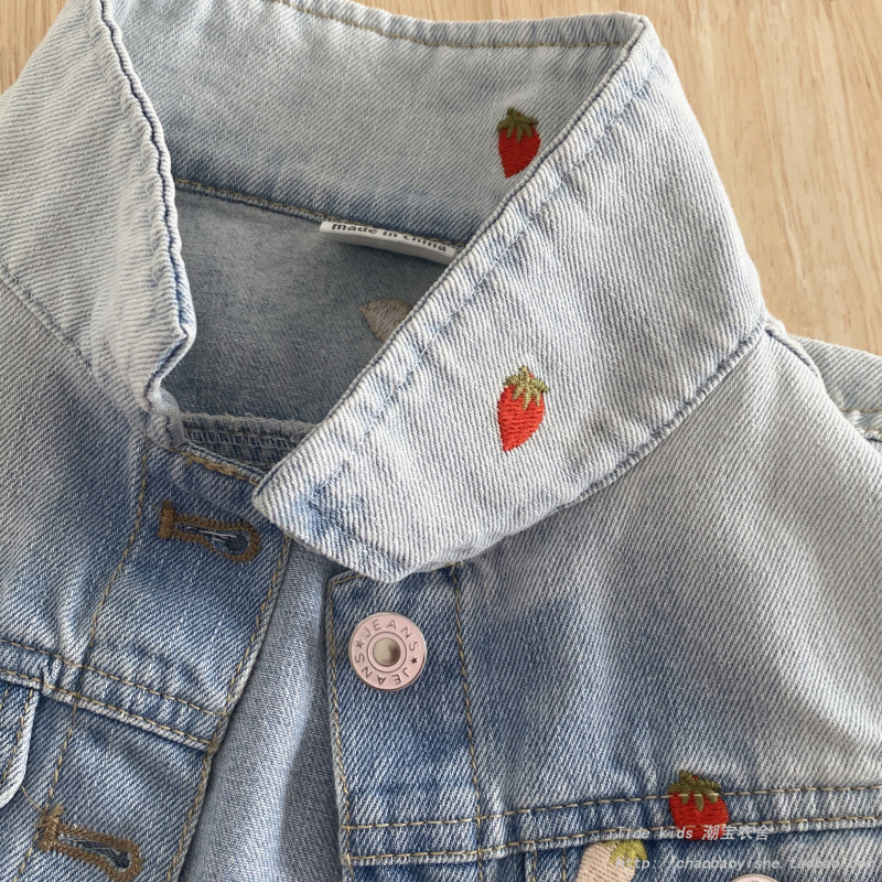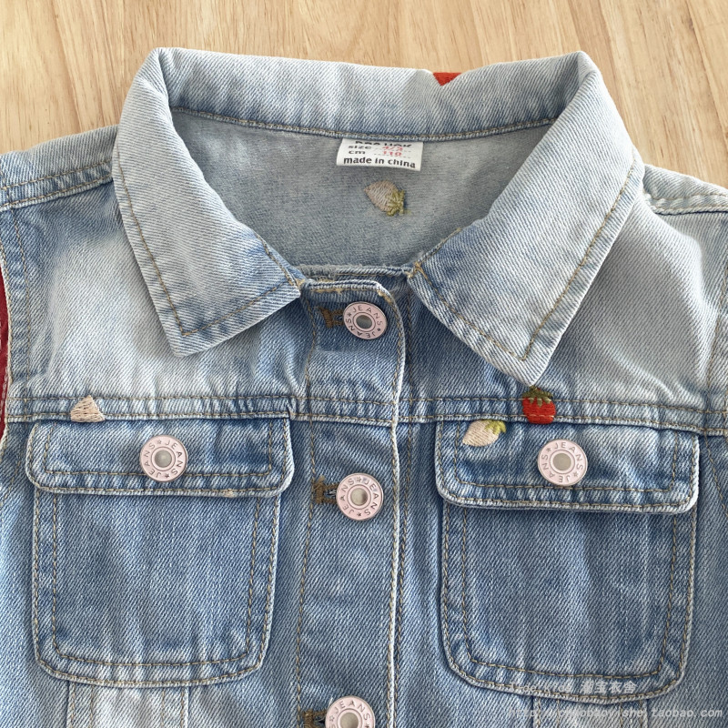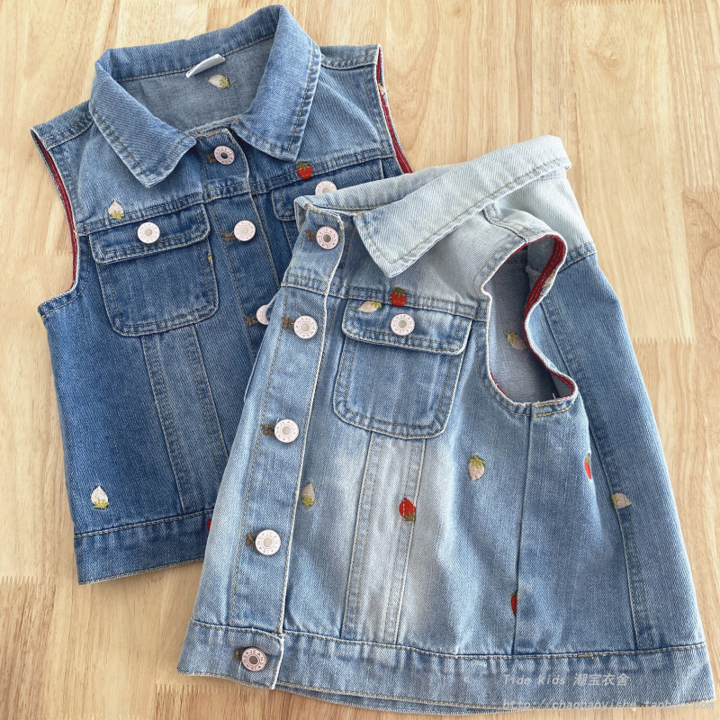 女童牛仔马甲春秋2026新款儿童洋气草莓刺绣外穿背心宝宝马夹上衣