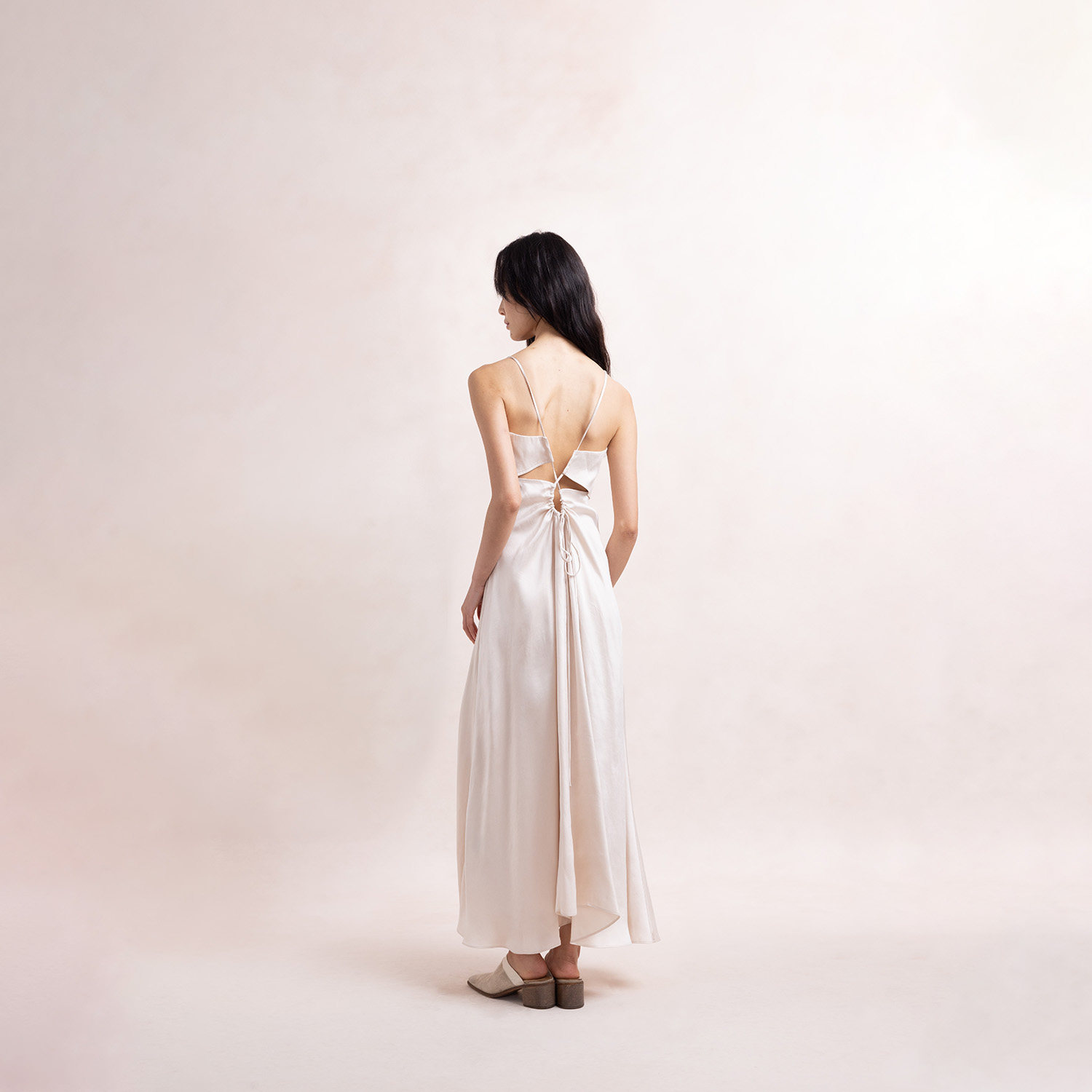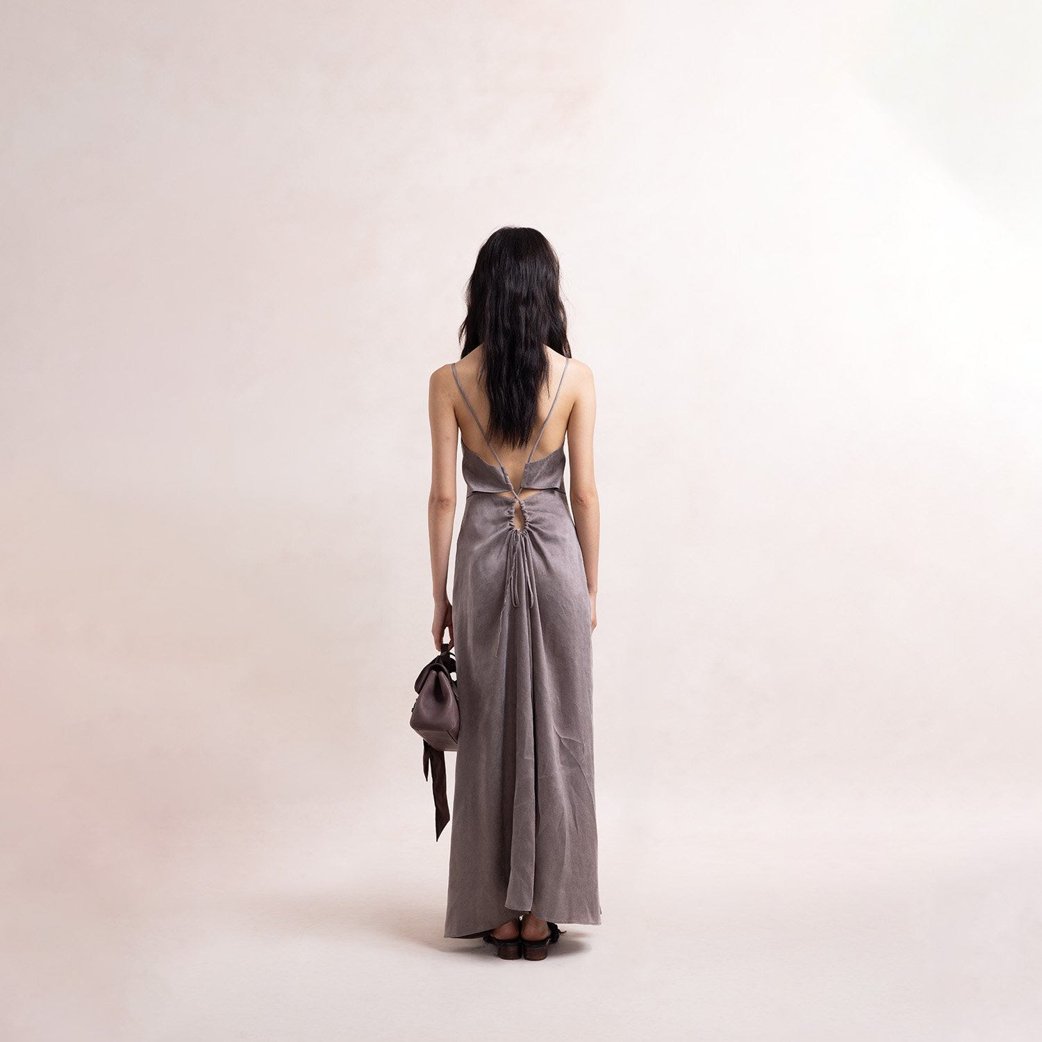 Elywood灰紫/珍珠白露背抽皱连衣裙海边度假吊带裙宽松显瘦长裙女