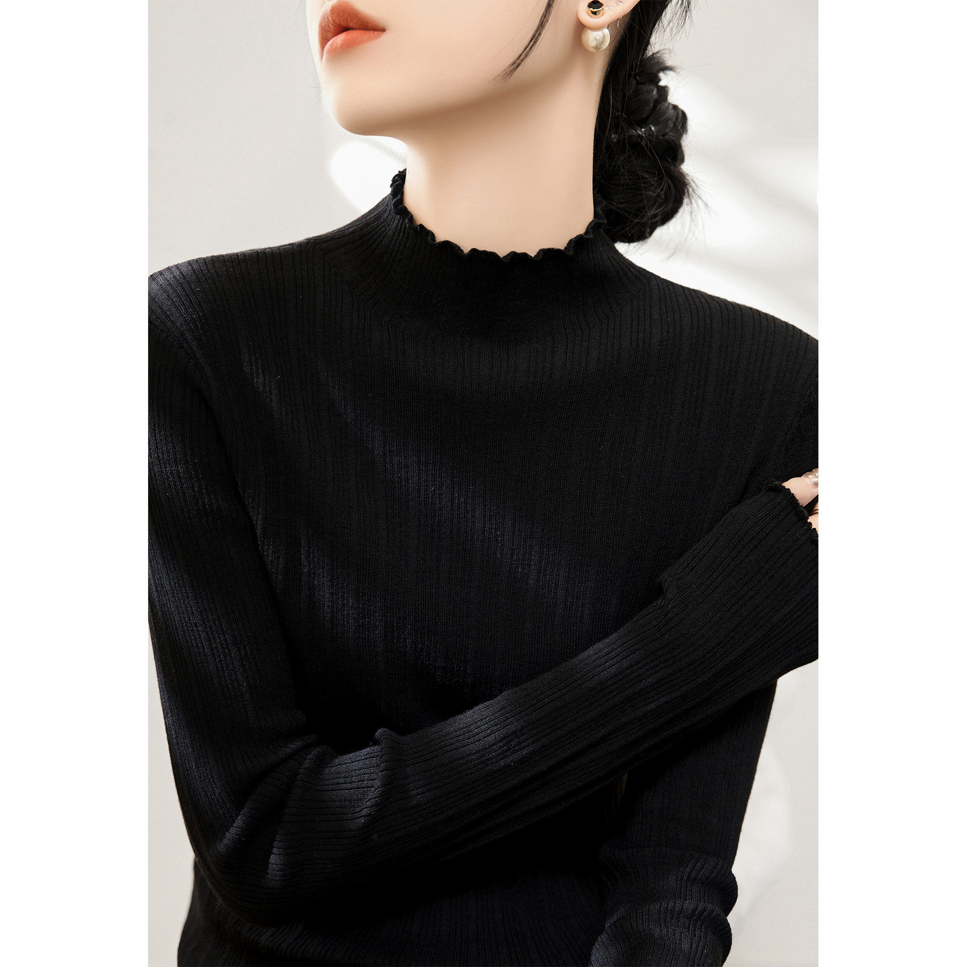高级感白色半高领木耳边舒适软糯设计针织衫女春季修身显瘦打底衫