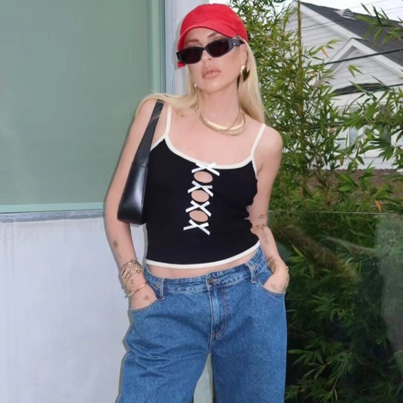 小众设计少女辣妹百搭镂空蝴蝶结饰针织吊带女夏 bow suspenders