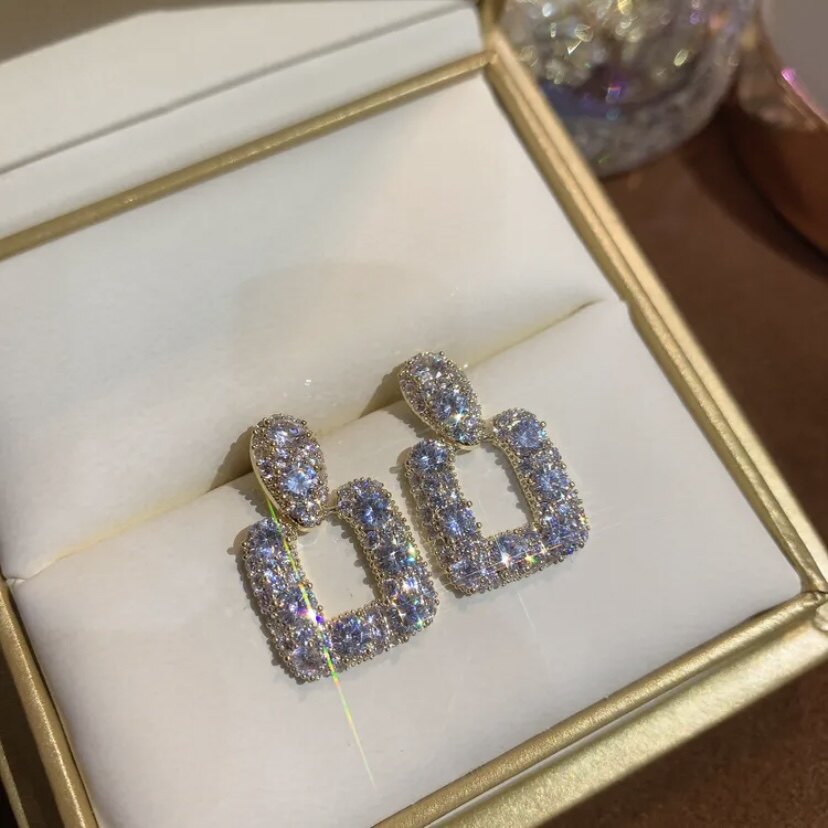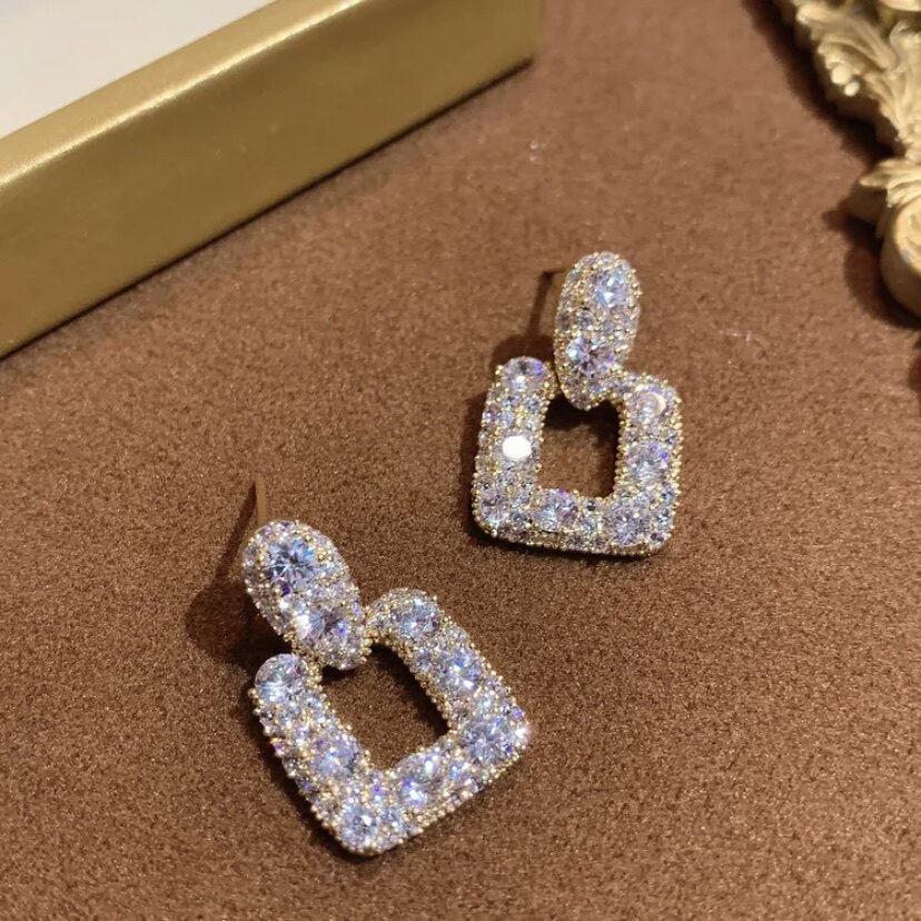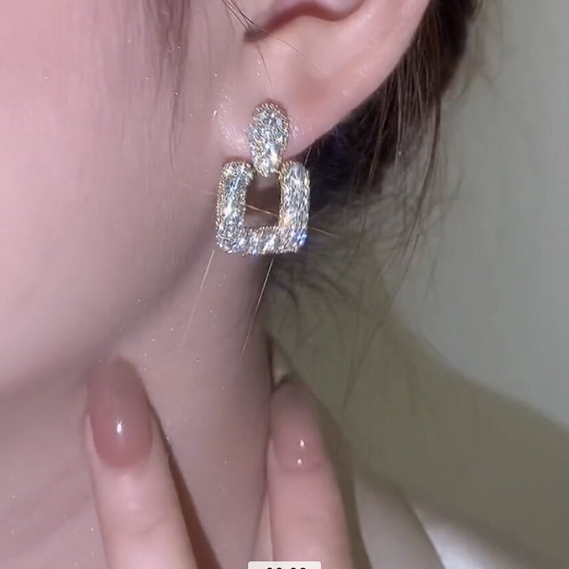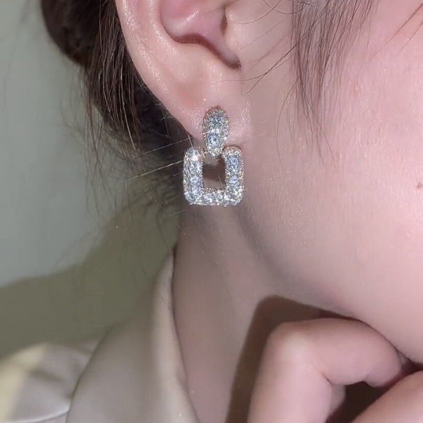 925银针超闪镶钻方形耳环女韩国个性百搭小众设计欧美夸张耳钉