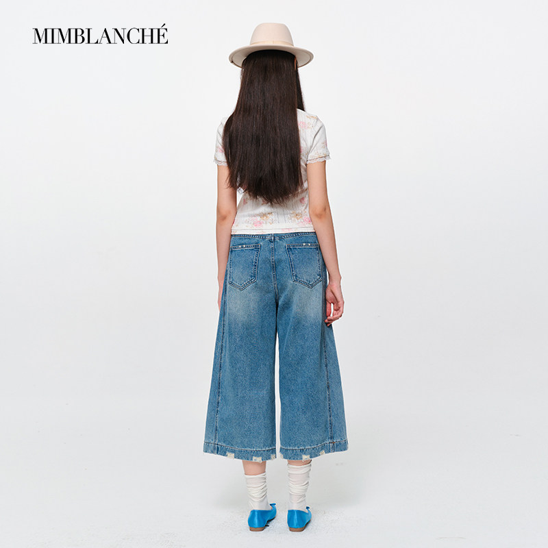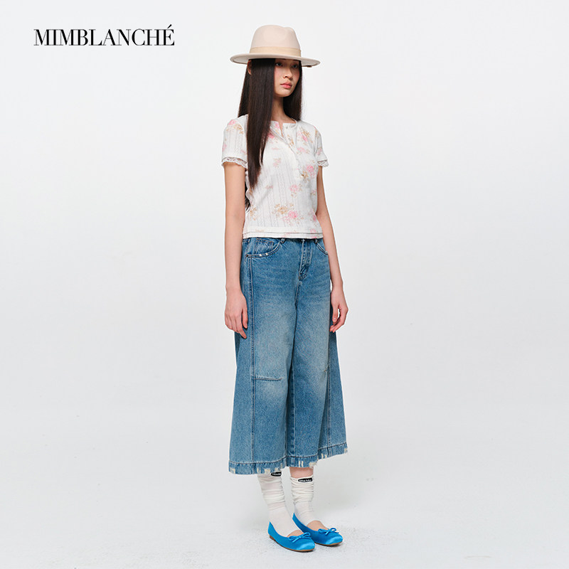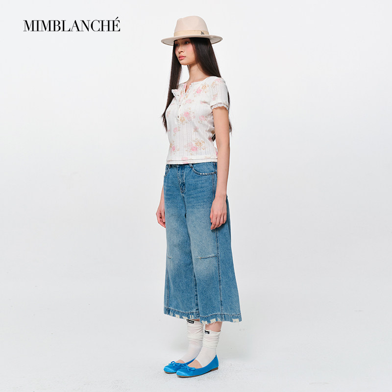 MIMBLANCHE碎花亨利领蕾丝拼接短袖T恤女