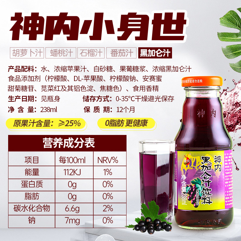 新疆神内黑加仑汁健康食品果蔬汁238ml*10瓶葡萄果味代餐解腻果汁