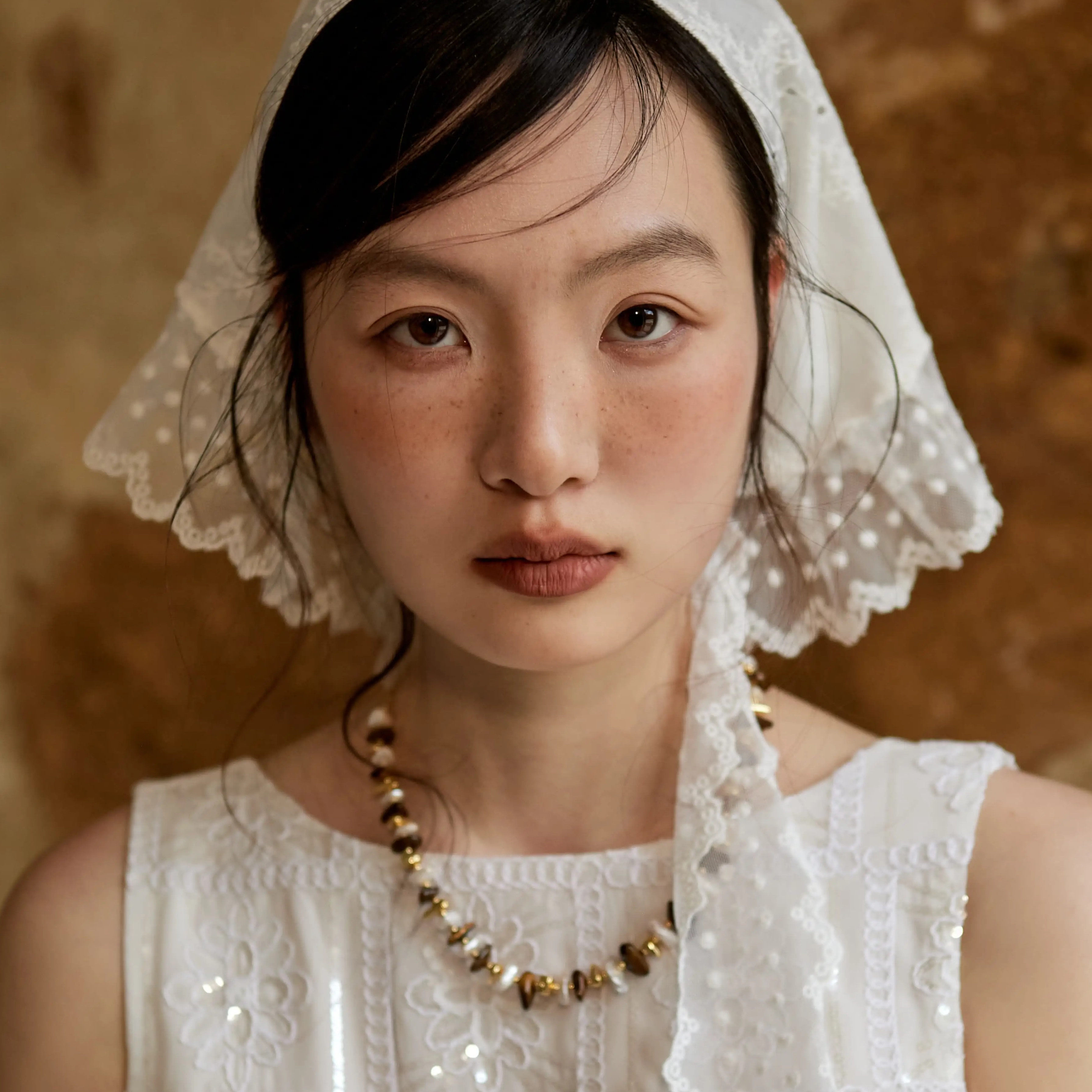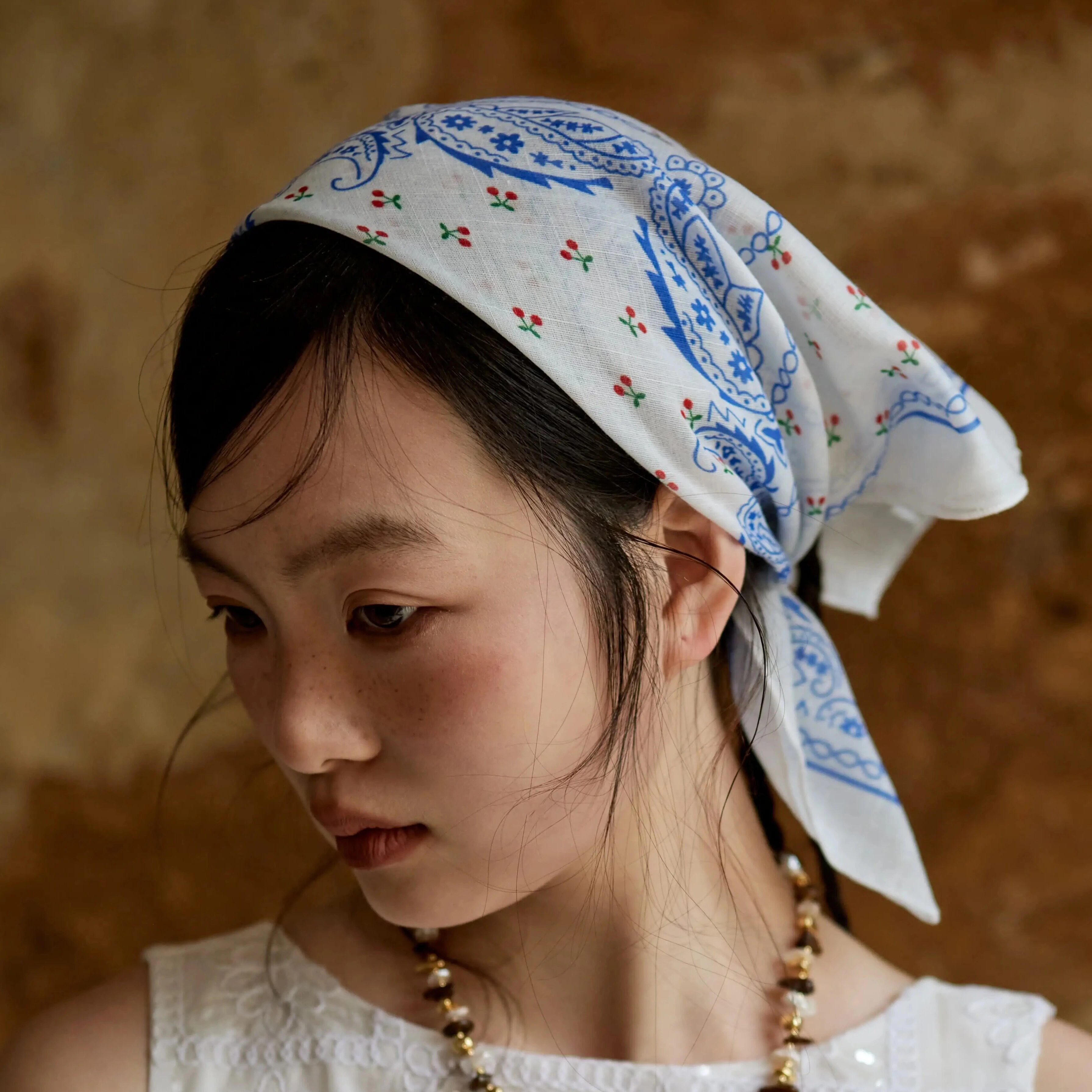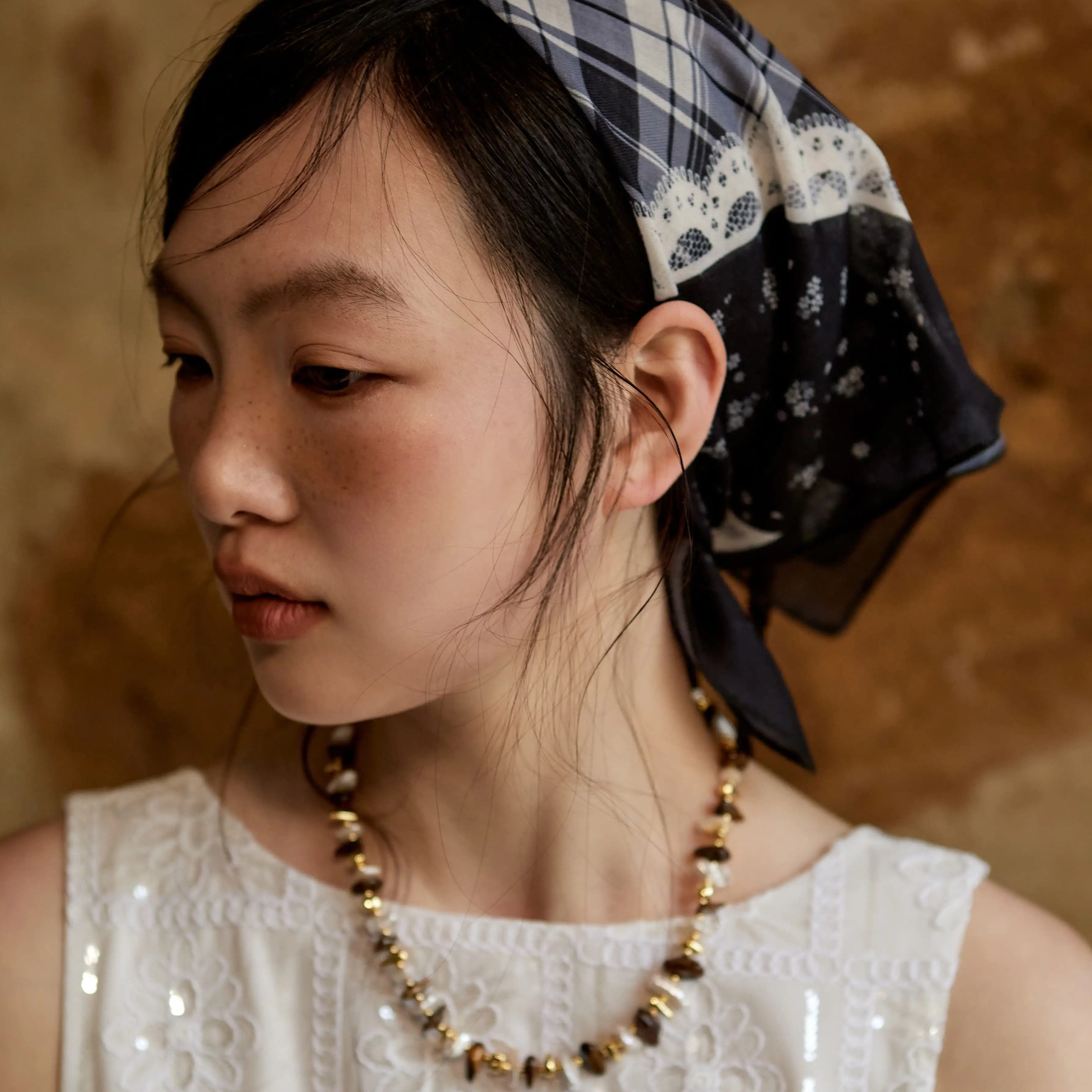 Shiitake【张含韵同款】黑白格子蓝色腰果花白蕾丝印花方巾头巾