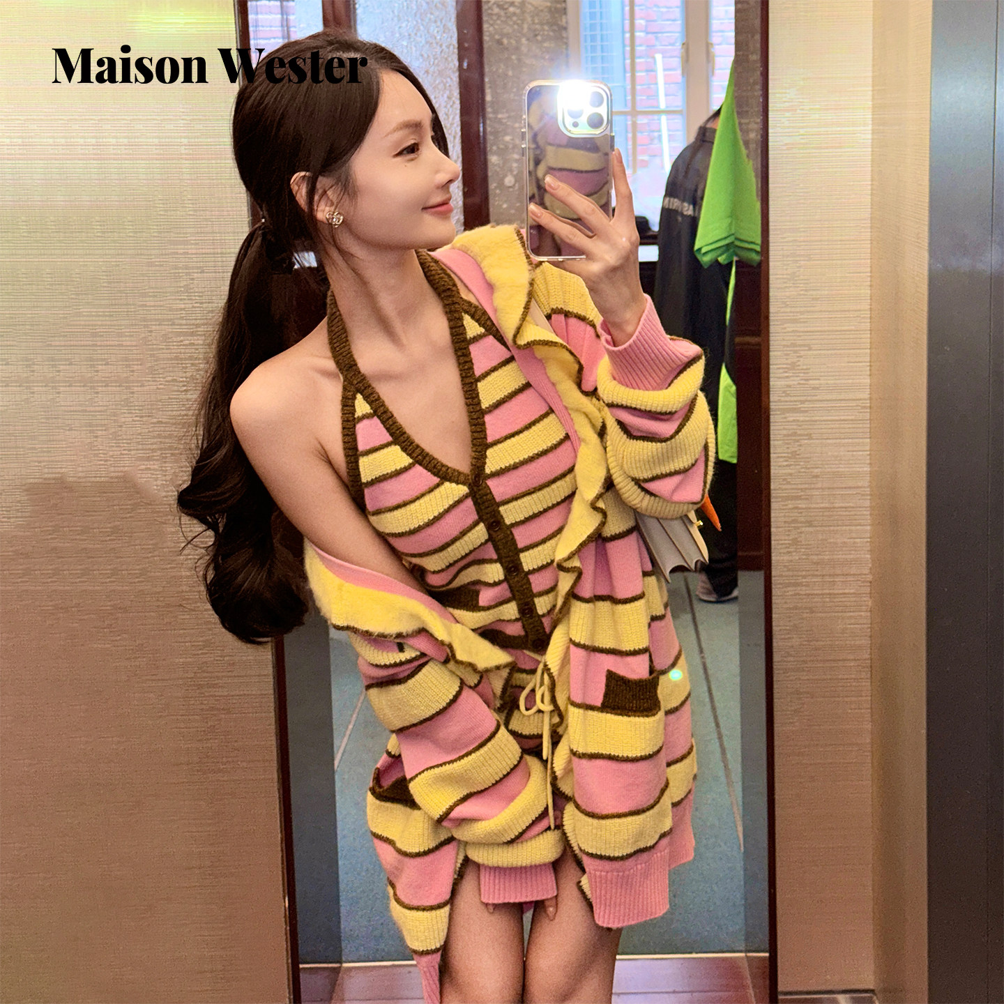 Maison Wester2026春新品荷叶边长袖慵懒风开衫挂脖背心短裤