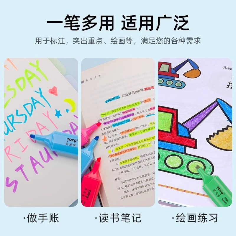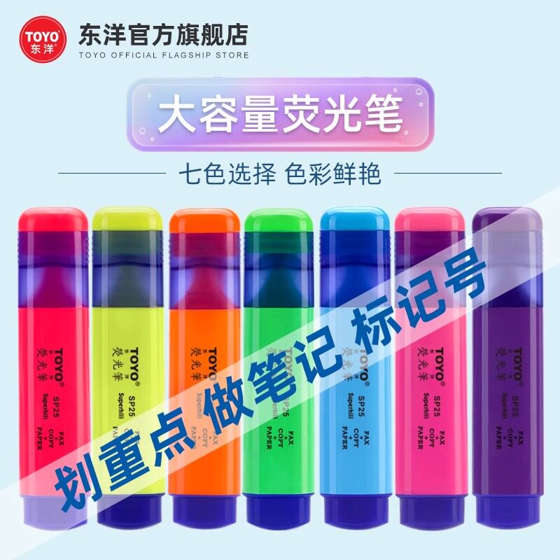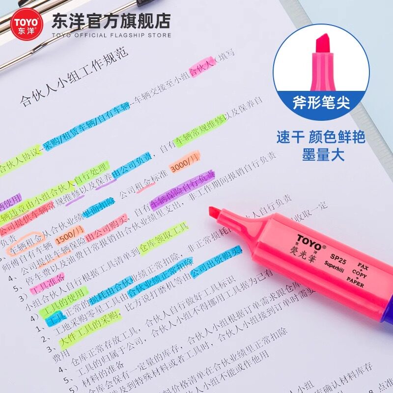 TOYO东洋SP25荧光笔无香黄蓝绿红橙紫粉色斜头手账大容量学生用护眼粗颜值荧光色笔标记速干官方旗舰店记号笔