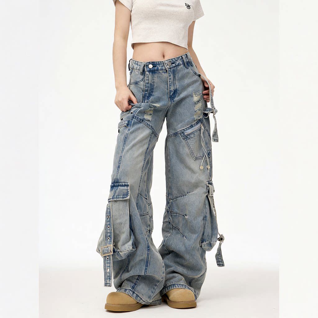 胖mm多口袋工装牛仔裤男女直筒宽松阔腿美式高街裤子潮流百搭痞帅