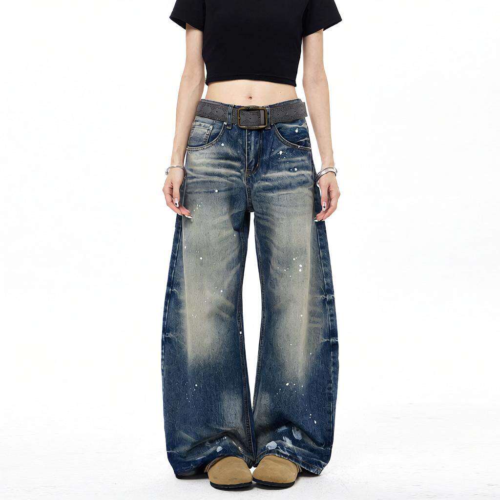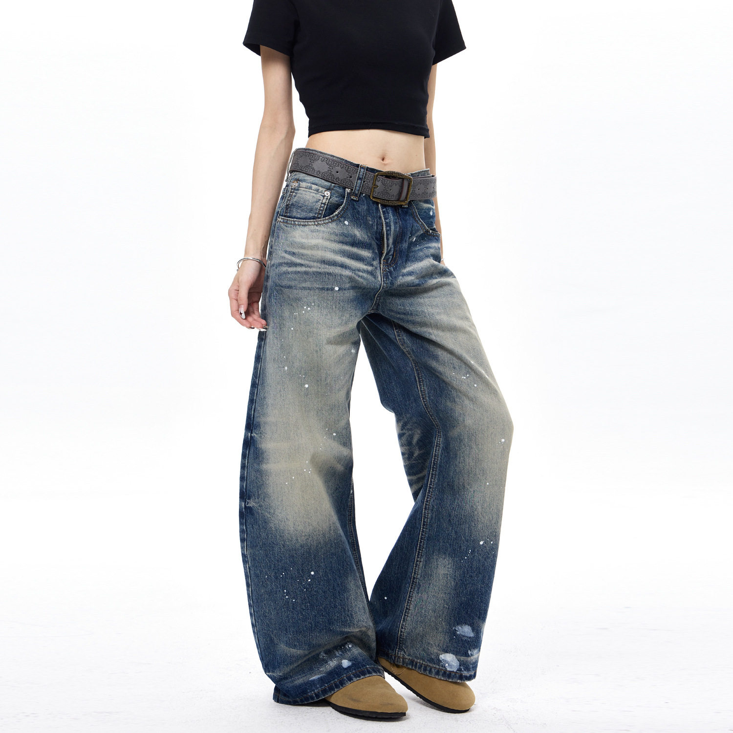 胖mm复古泼墨牛仔裤男直筒宽松弯刀阔腿美式高街裤子潮牌痞帅水洗