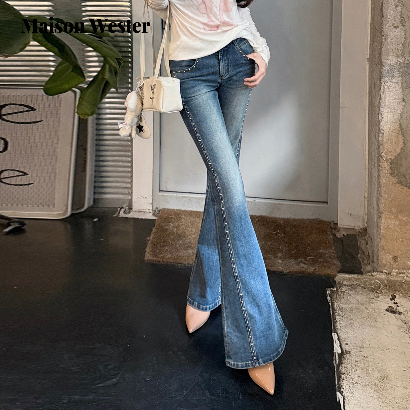【徐如蓝同款】Maison Wester2026春灰调铆钉喇叭牛仔裤子长裤