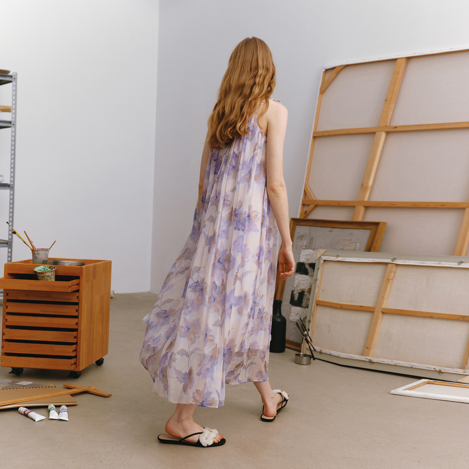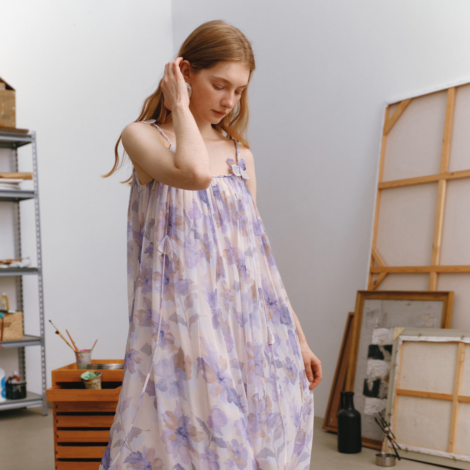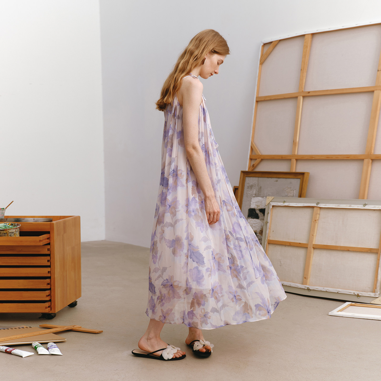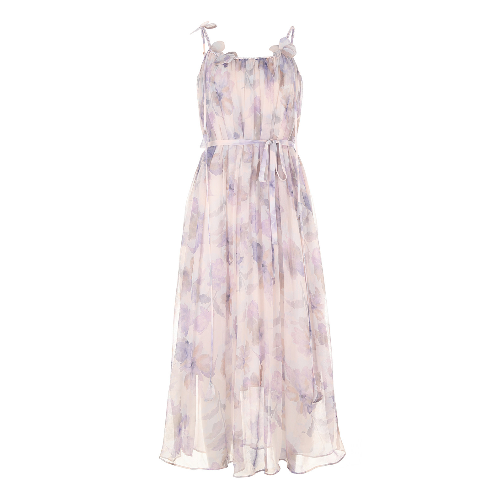 wana try100%桑蚕丝风信紫印花仙女感吊带裙2025夏新品气质连衣裙
