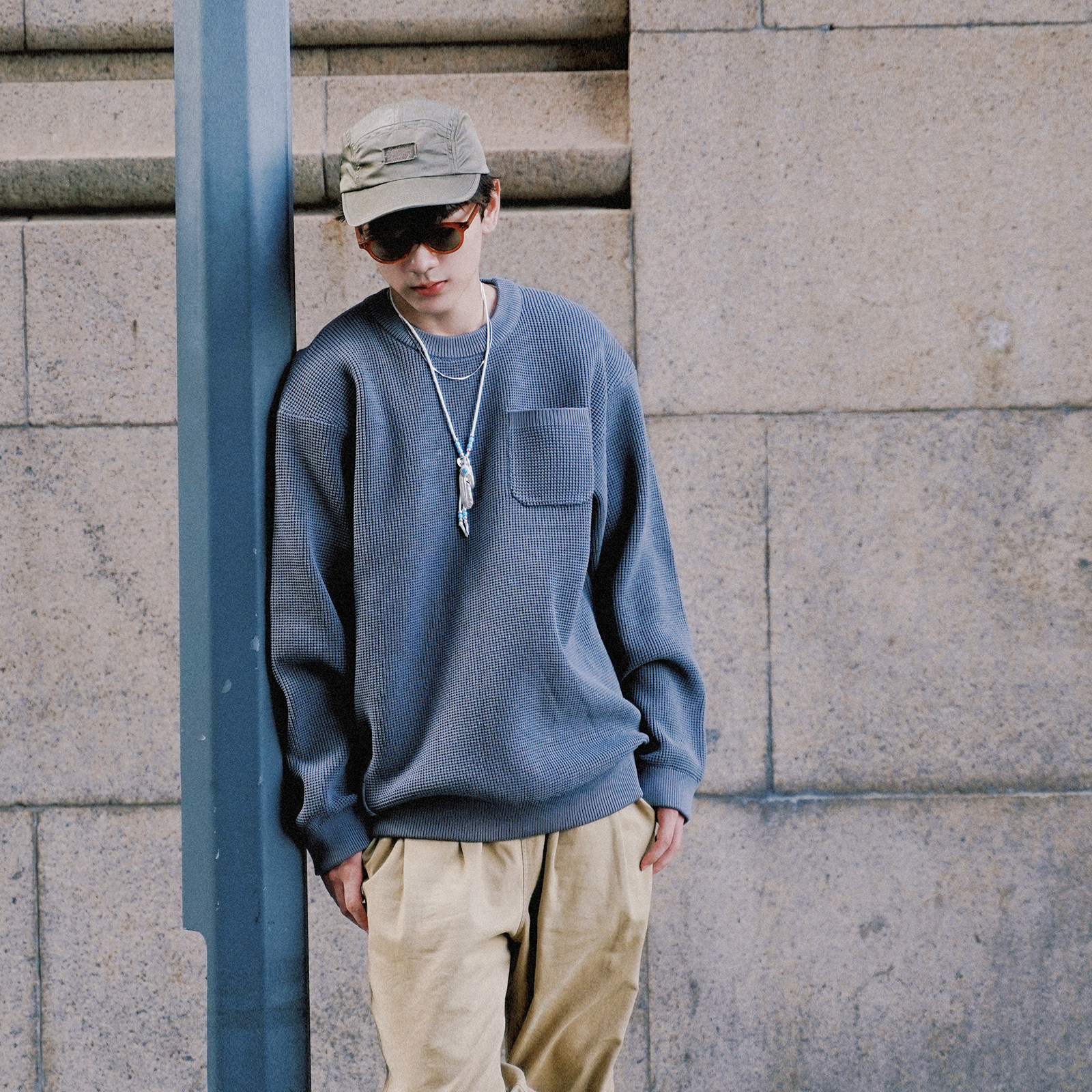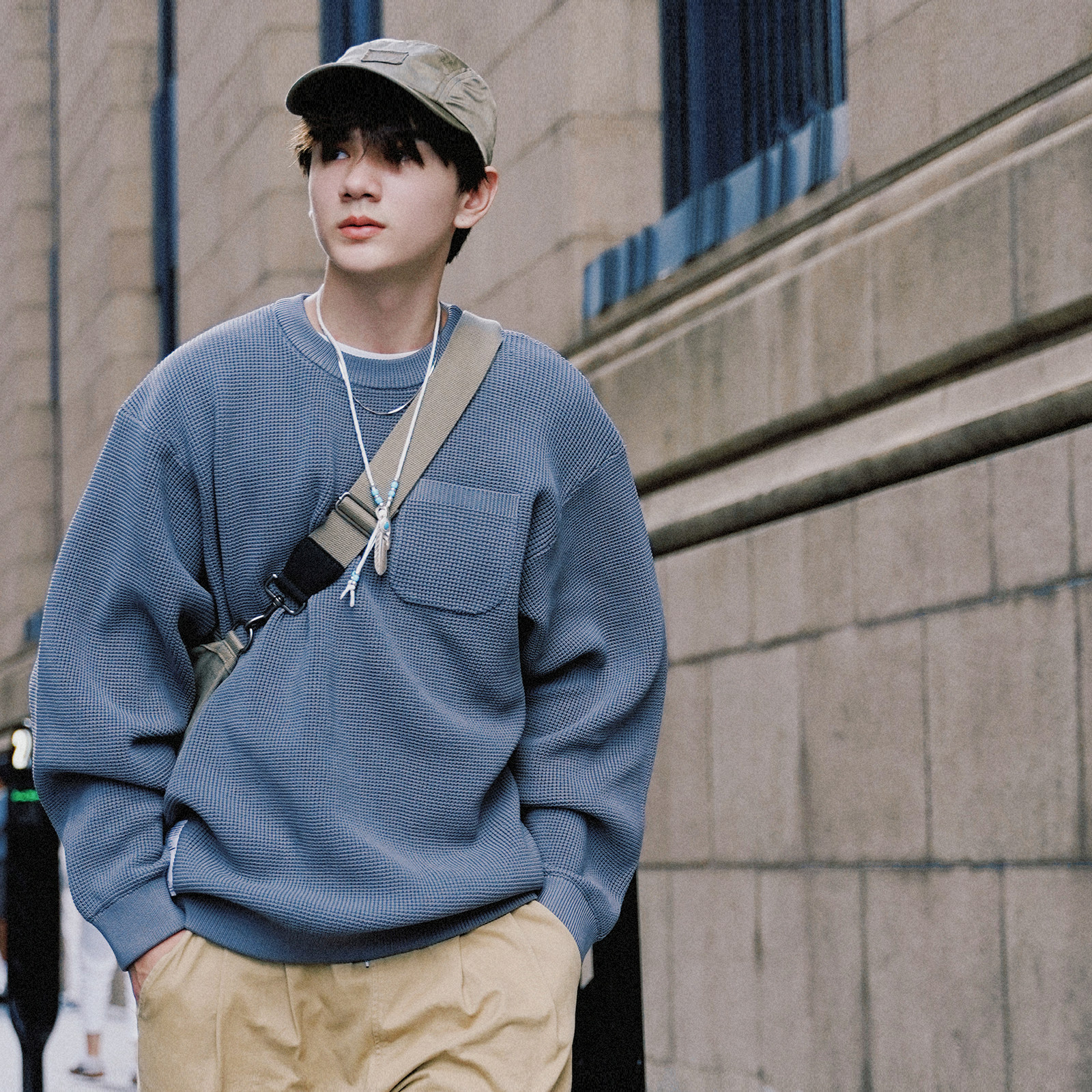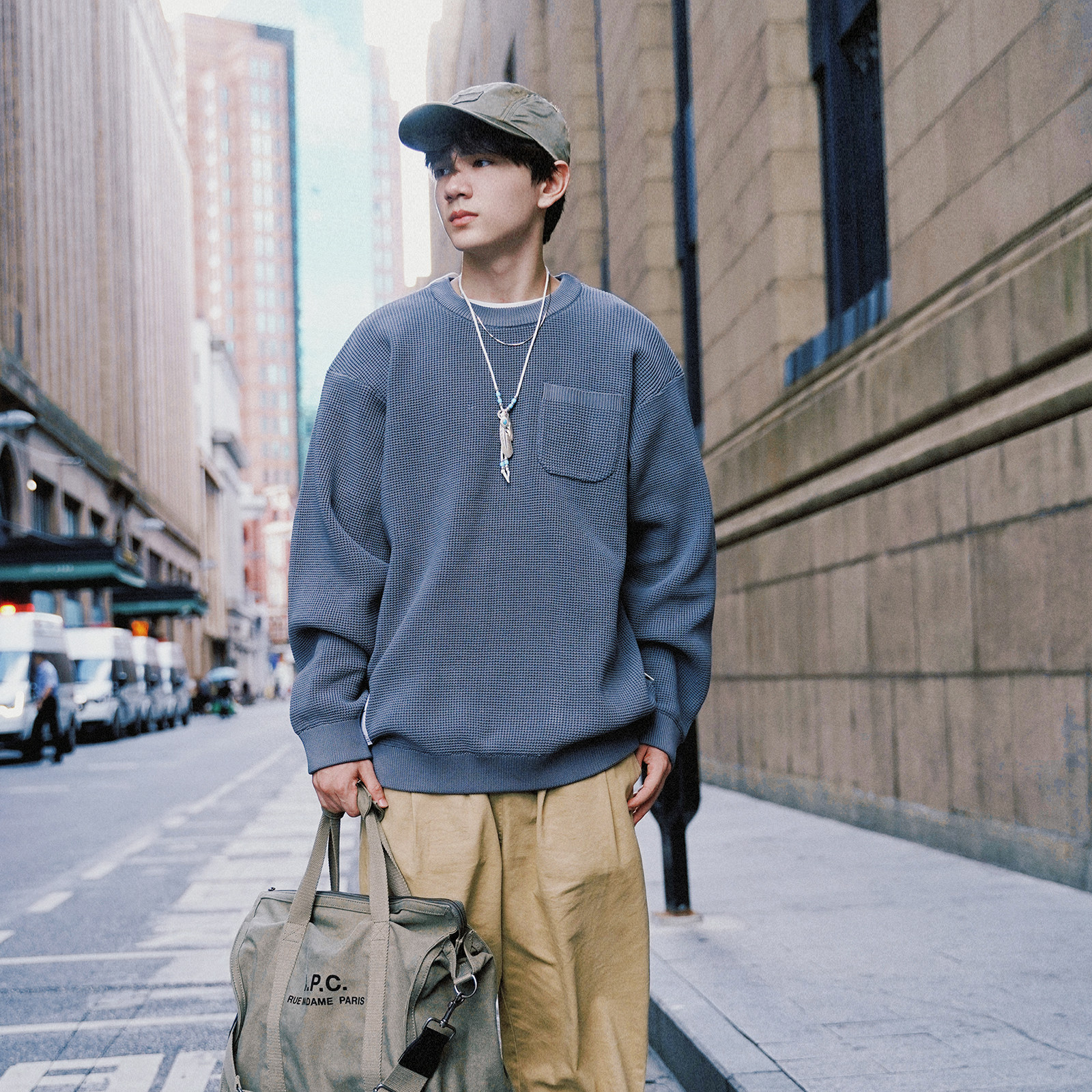 foundry 25AW日系简约百搭宽松落肩圆领套头口袋长袖华夫格卫衣男