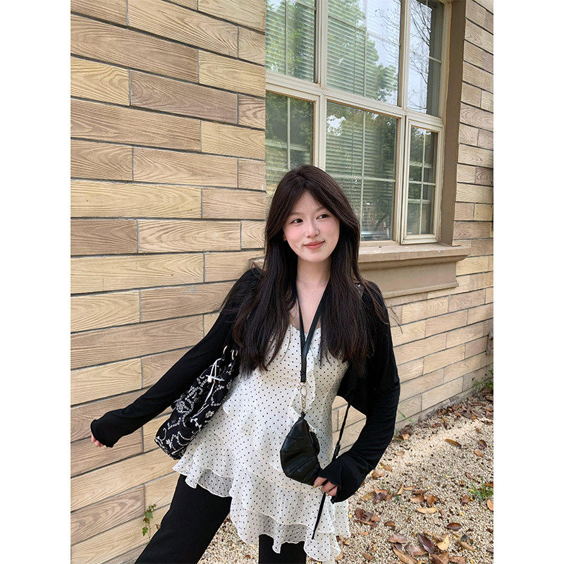 巨鹿工作室微胖mm韩系覆古波点不规则木耳边吊带洋装叠穿百搭裙