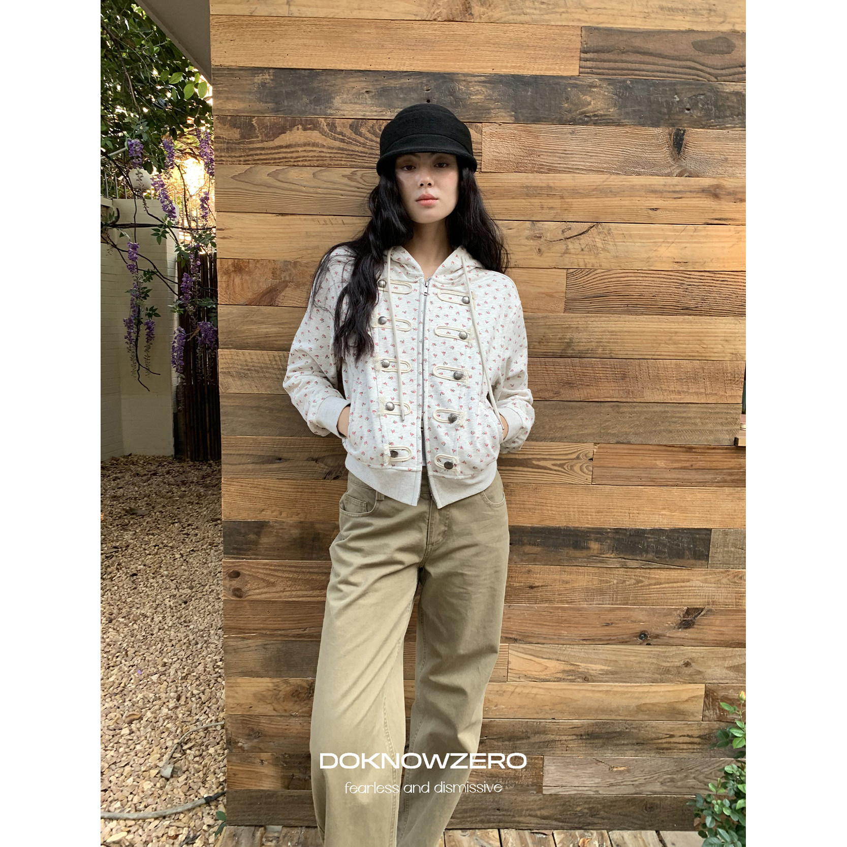 DKZ 骑士感卫衣开衫外套女春季新款短款碎花印花上衣