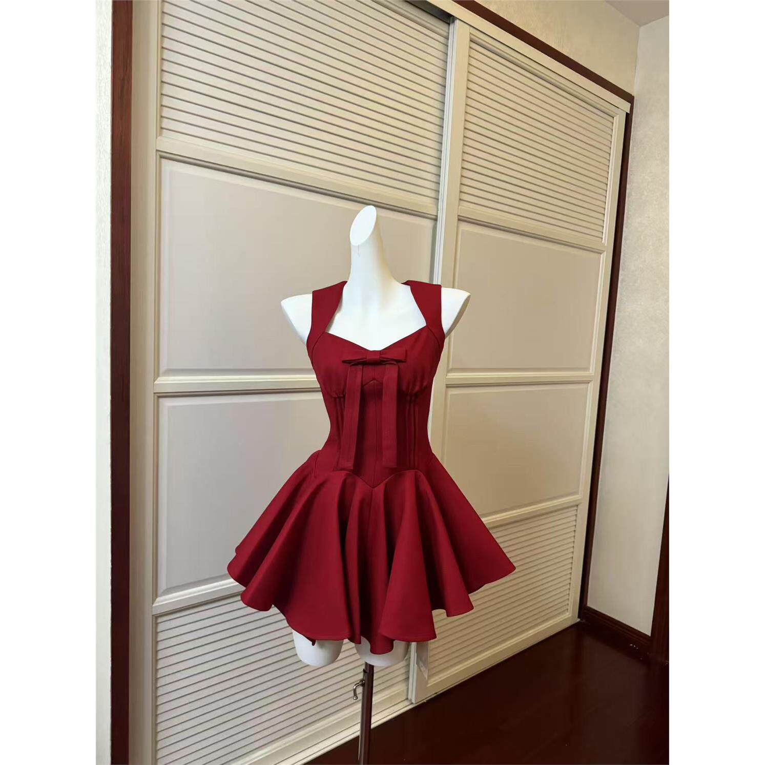 玫瑰人生 四米裙摆公主裙蝴蝶结千金感无袖收腰连衣裙贝微微红裙