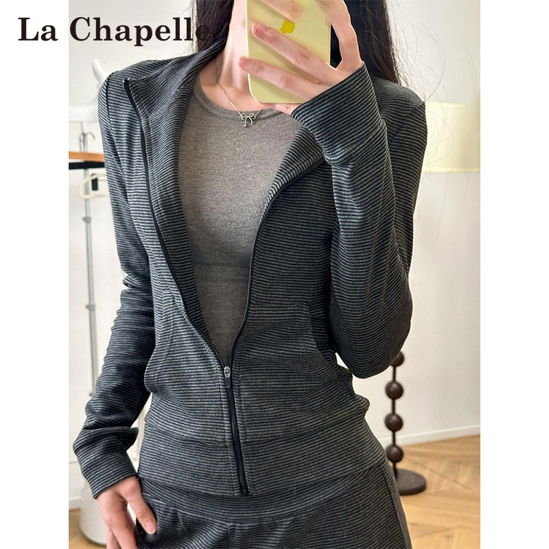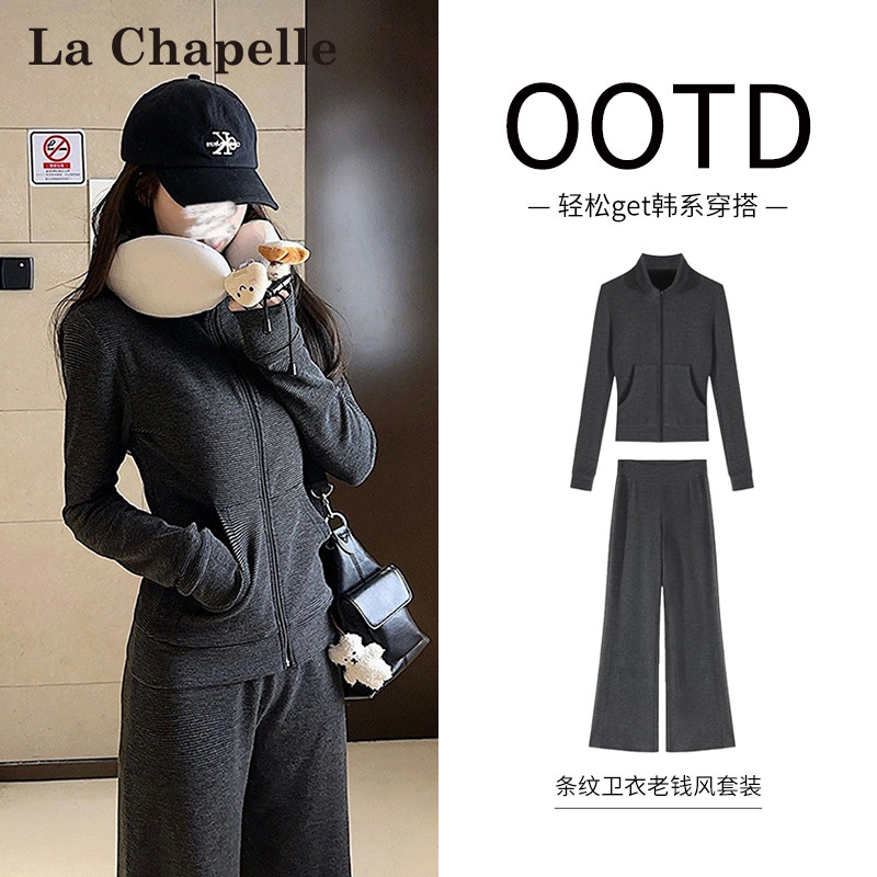 拉夏贝尔老钱风早春轻薄卫衣套装女冬条纹卫衣卫裤两件套修身外套
