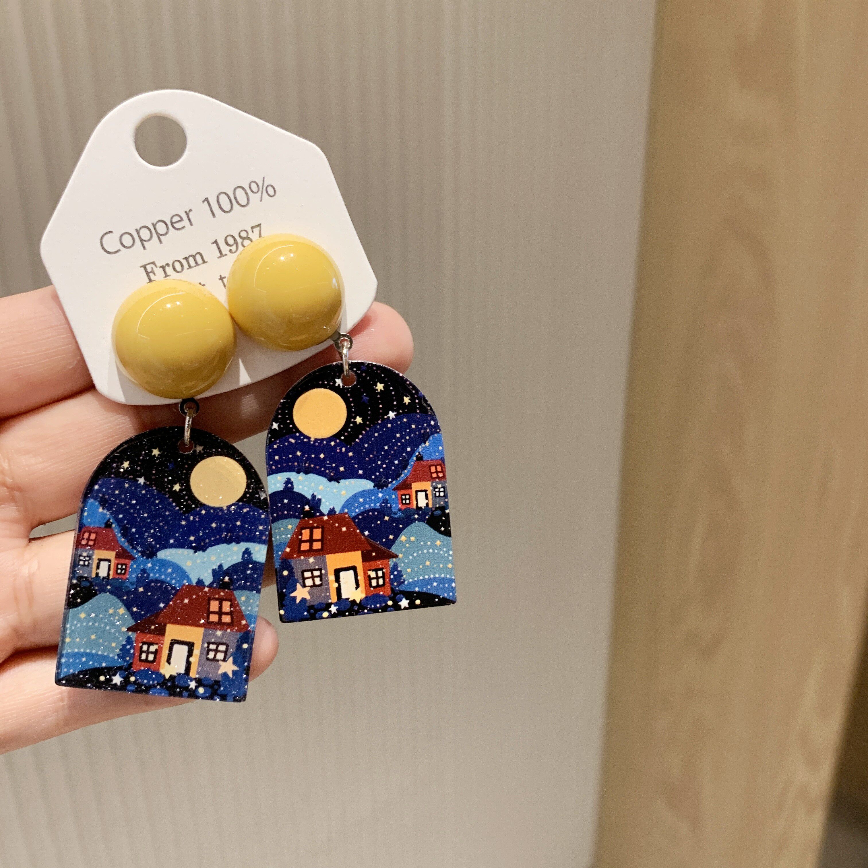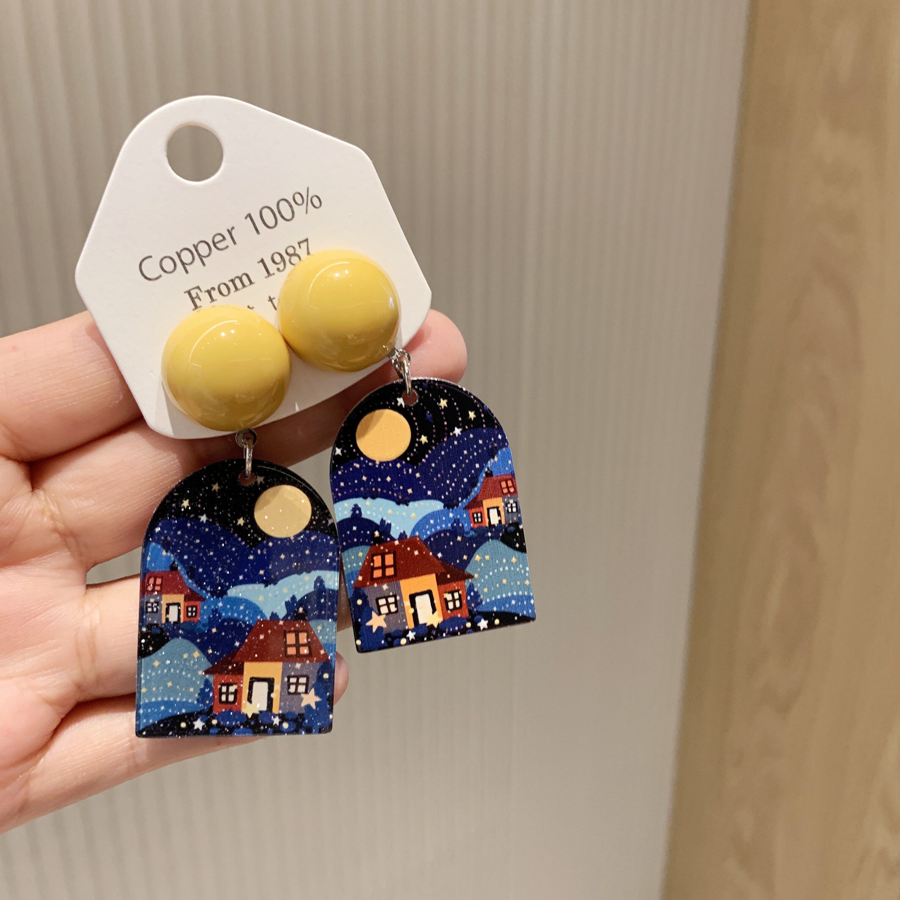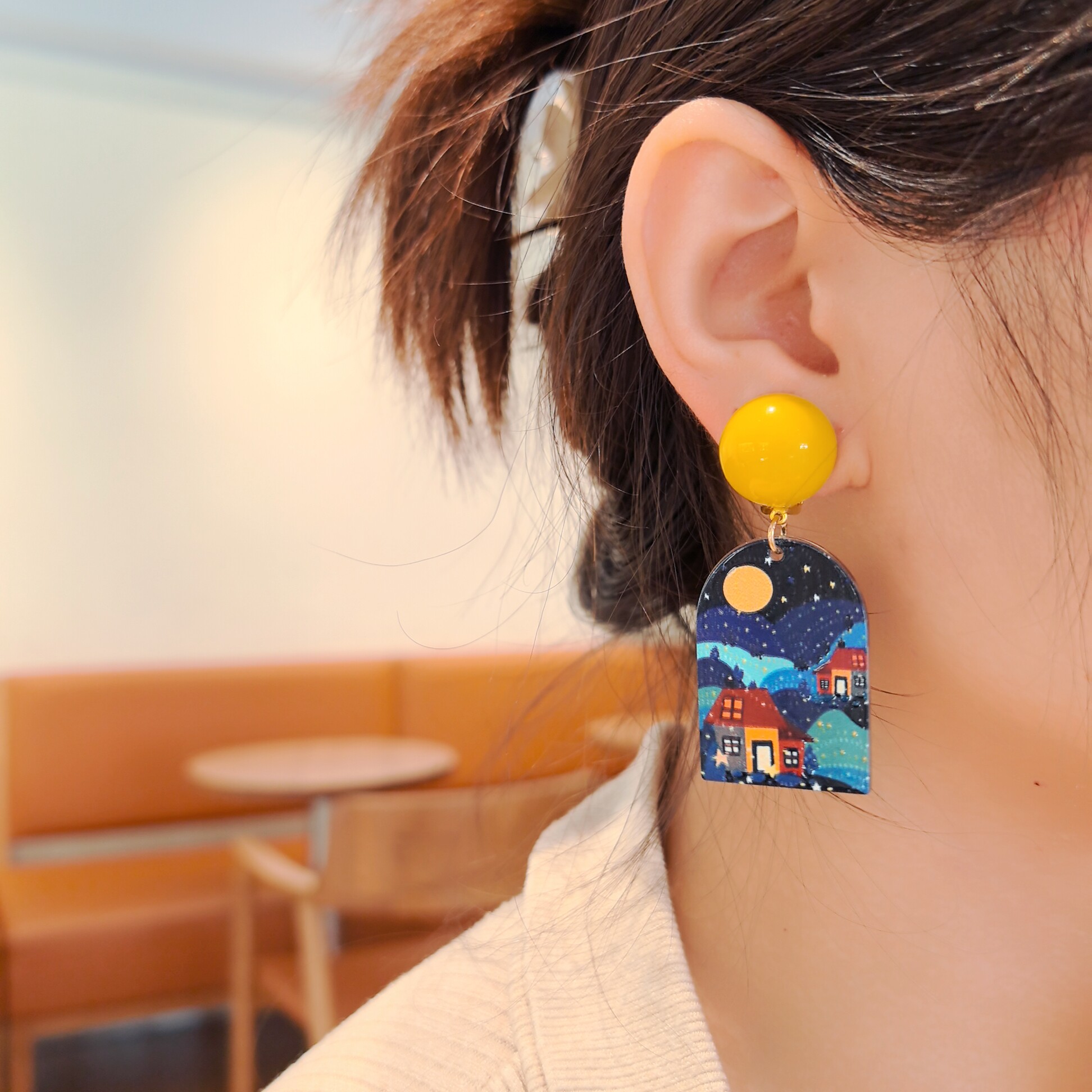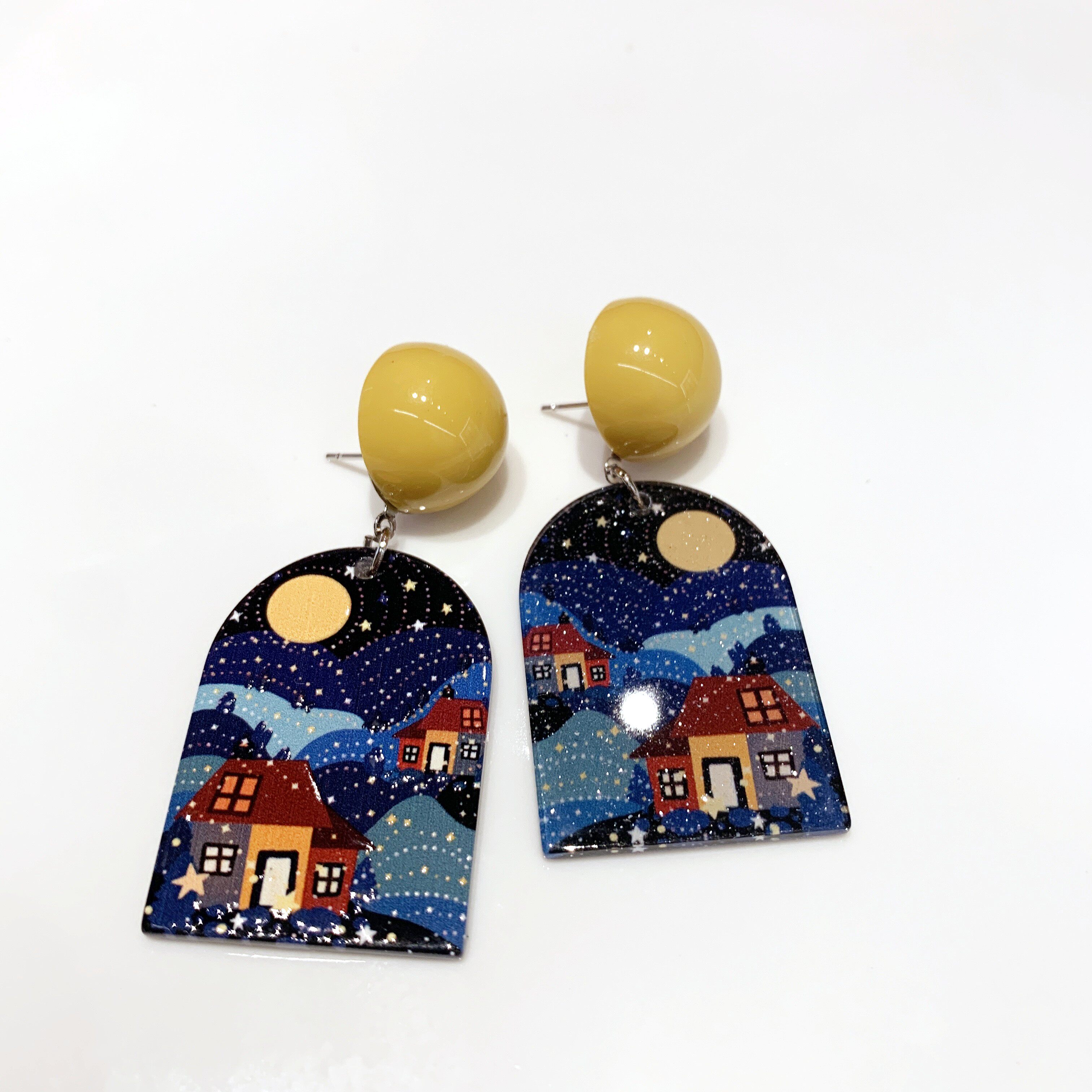 沐琪手作梵高油画风复古风景画亚克力星月耳环无洞耳夹