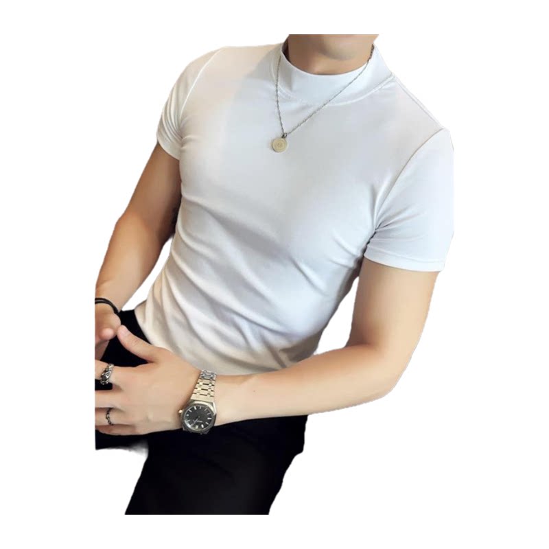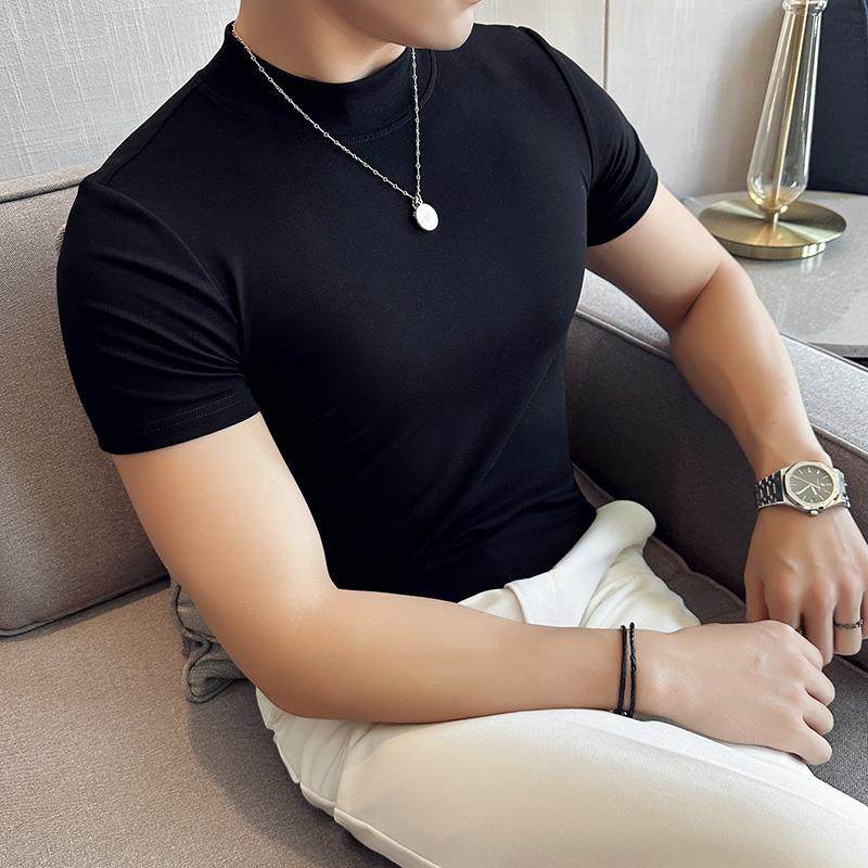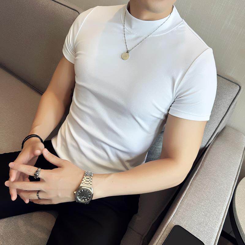男士纯棉短袖T恤休闲紧身潮流修身半高领打底衫韩版弹力中领半袖