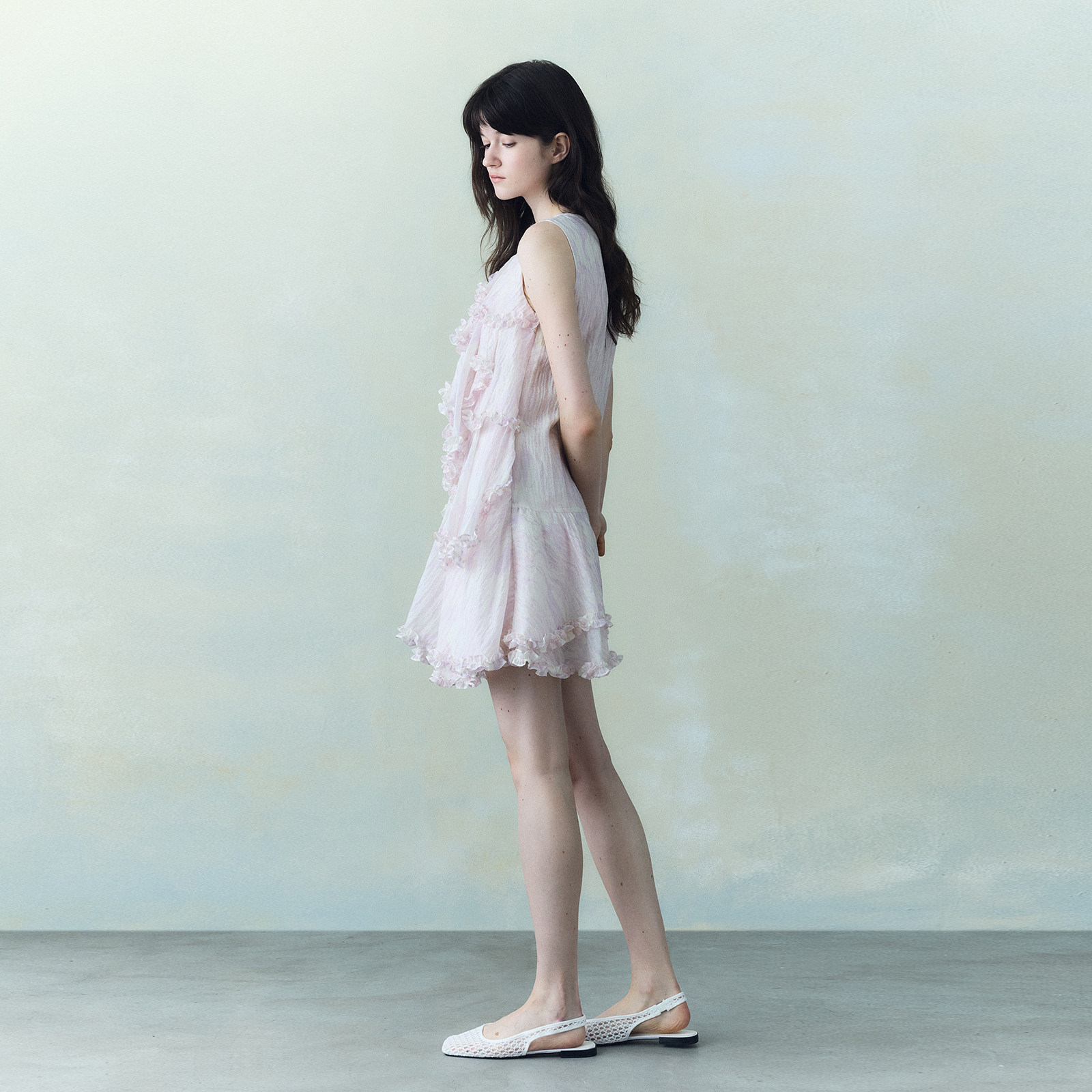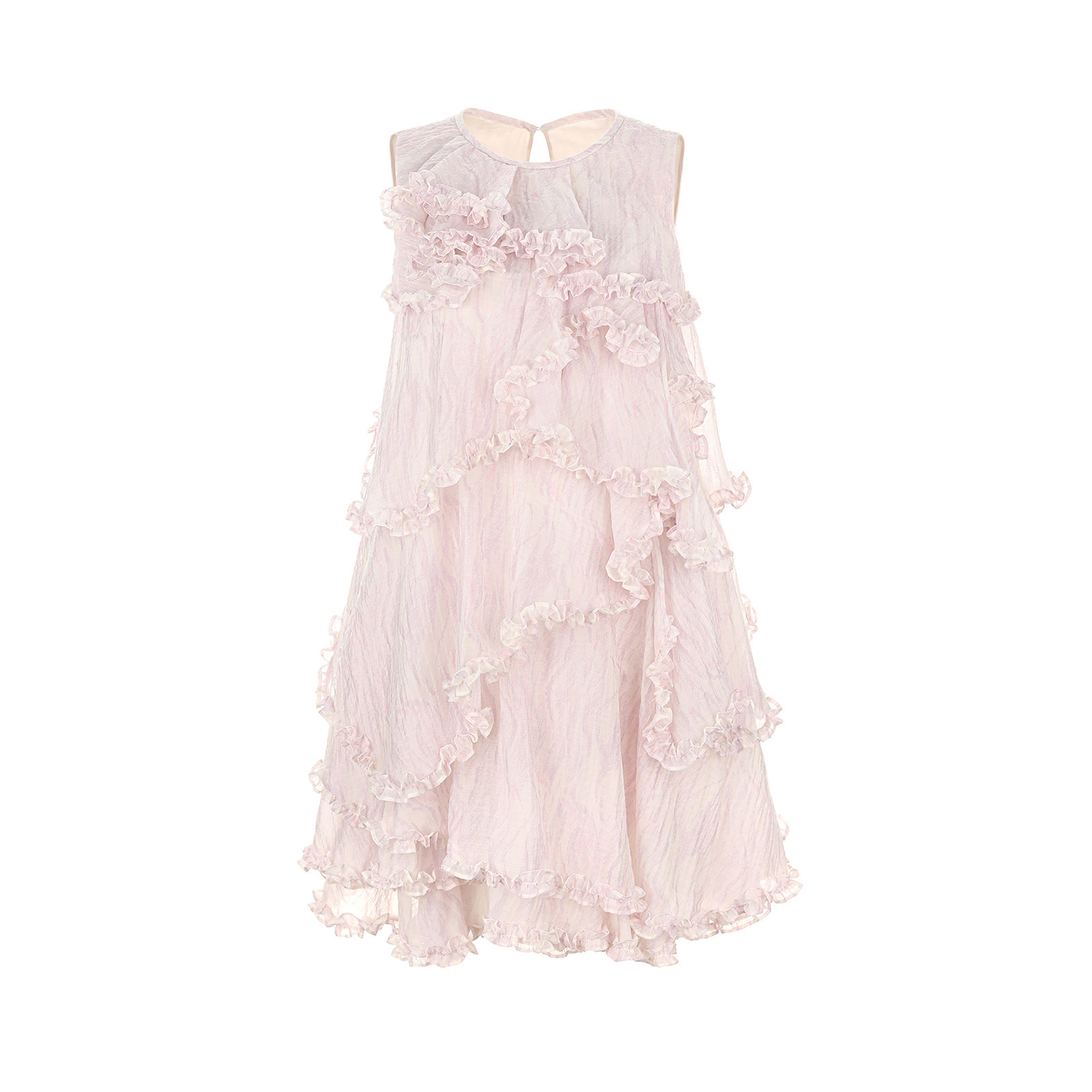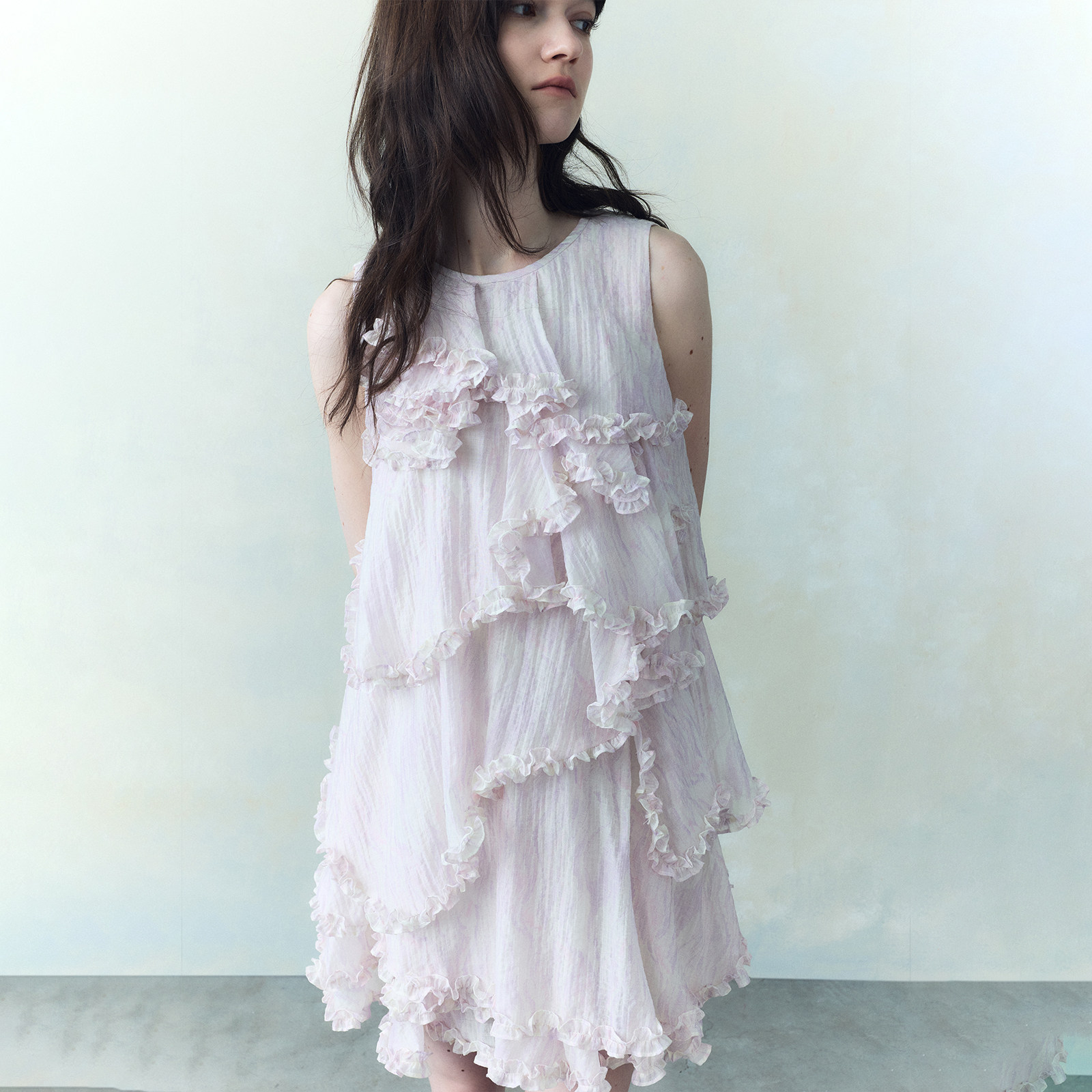 wana try迷雾紫印花层叠木耳边无袖裙2026春新品度假感时髦连衣裙