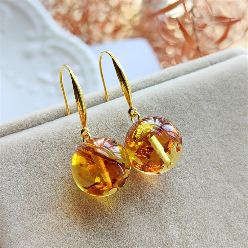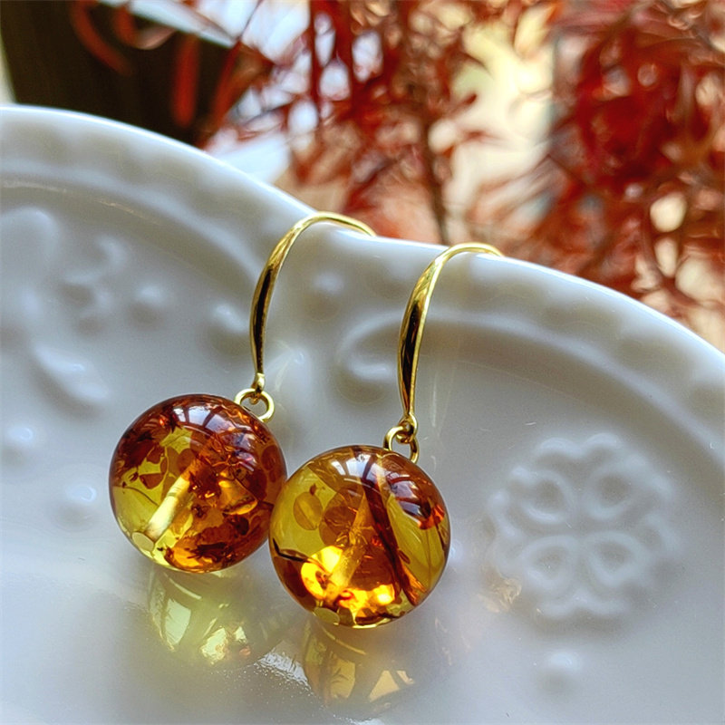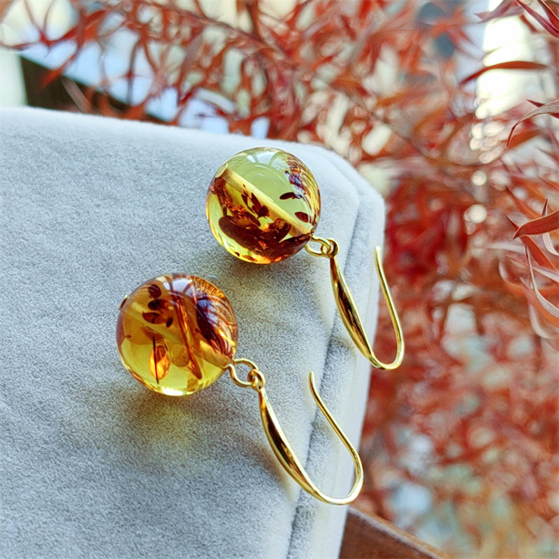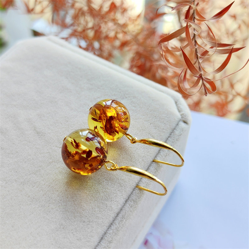 天然琥珀花珀耳环有机珠宝耳坠复古国潮气质优雅S925纯银镀金耳饰