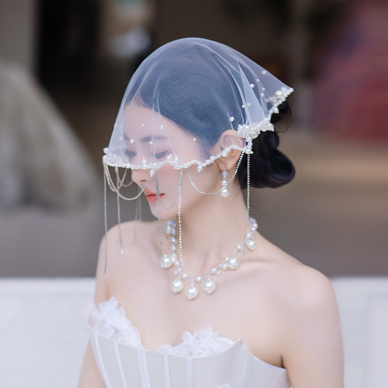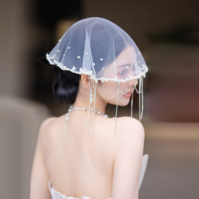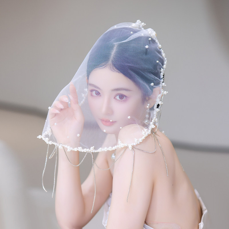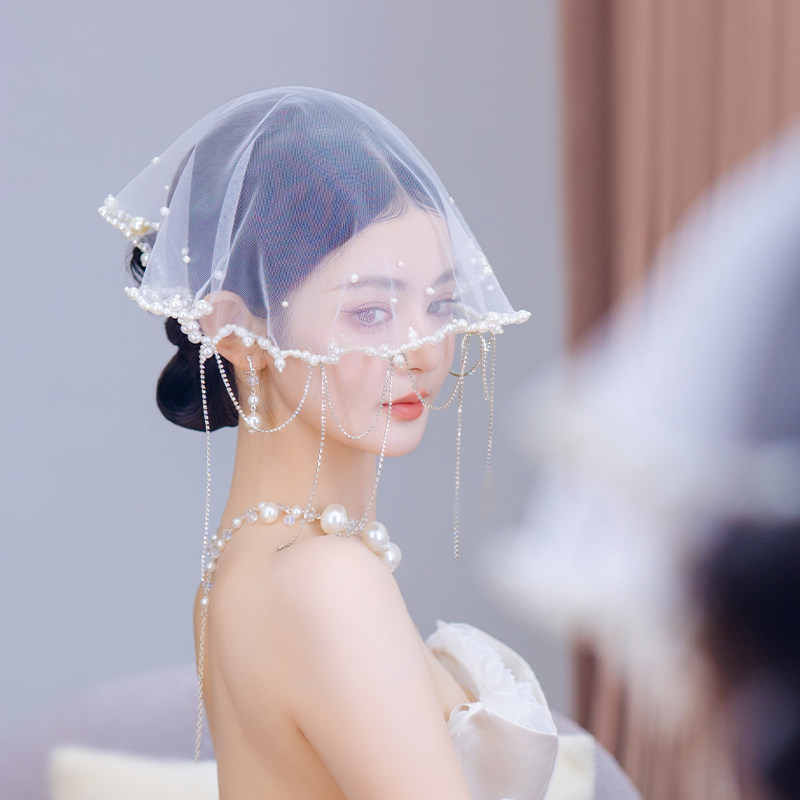 新娘法式高级感轻奢小头纱气质遮面氛围小众珍珠流苏婚纱礼服头饰