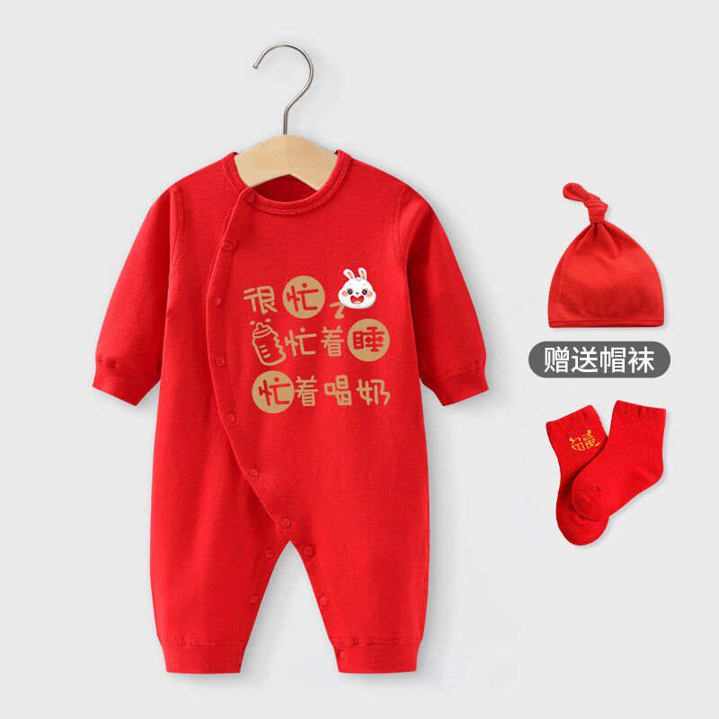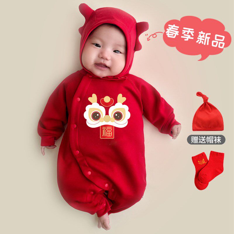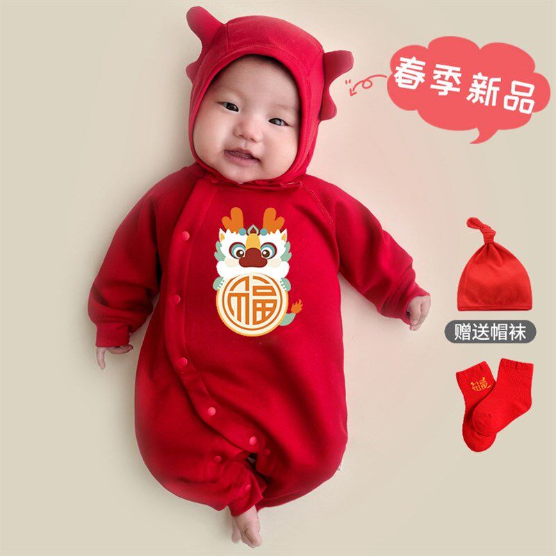 早秋新生婴儿连体衣服春秋款龙年满月百天宝宝初秋季套装男女红色