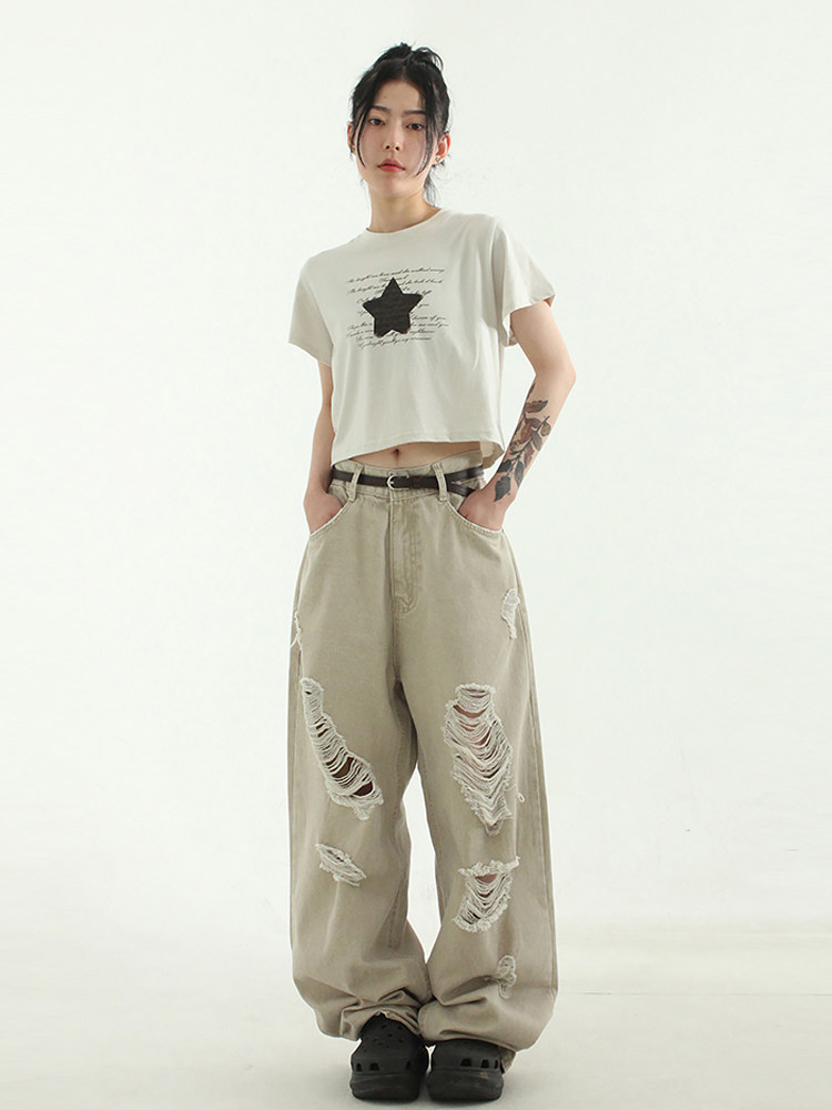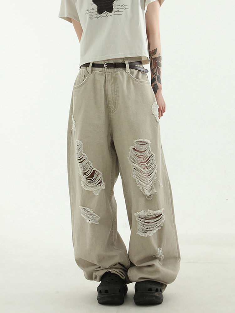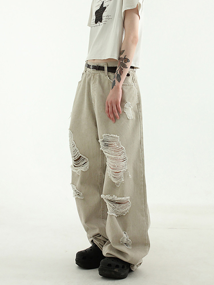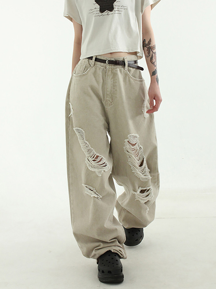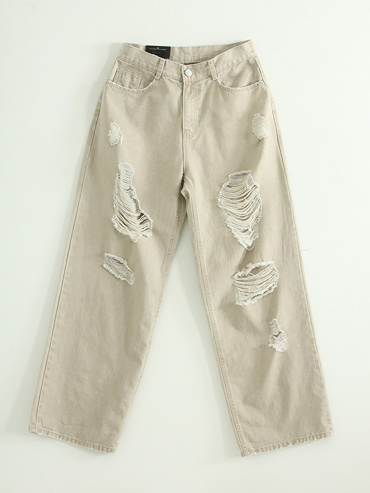 韩国代购23S/S beige damage wide jean (unisex) 破洞拉丝牛仔裤