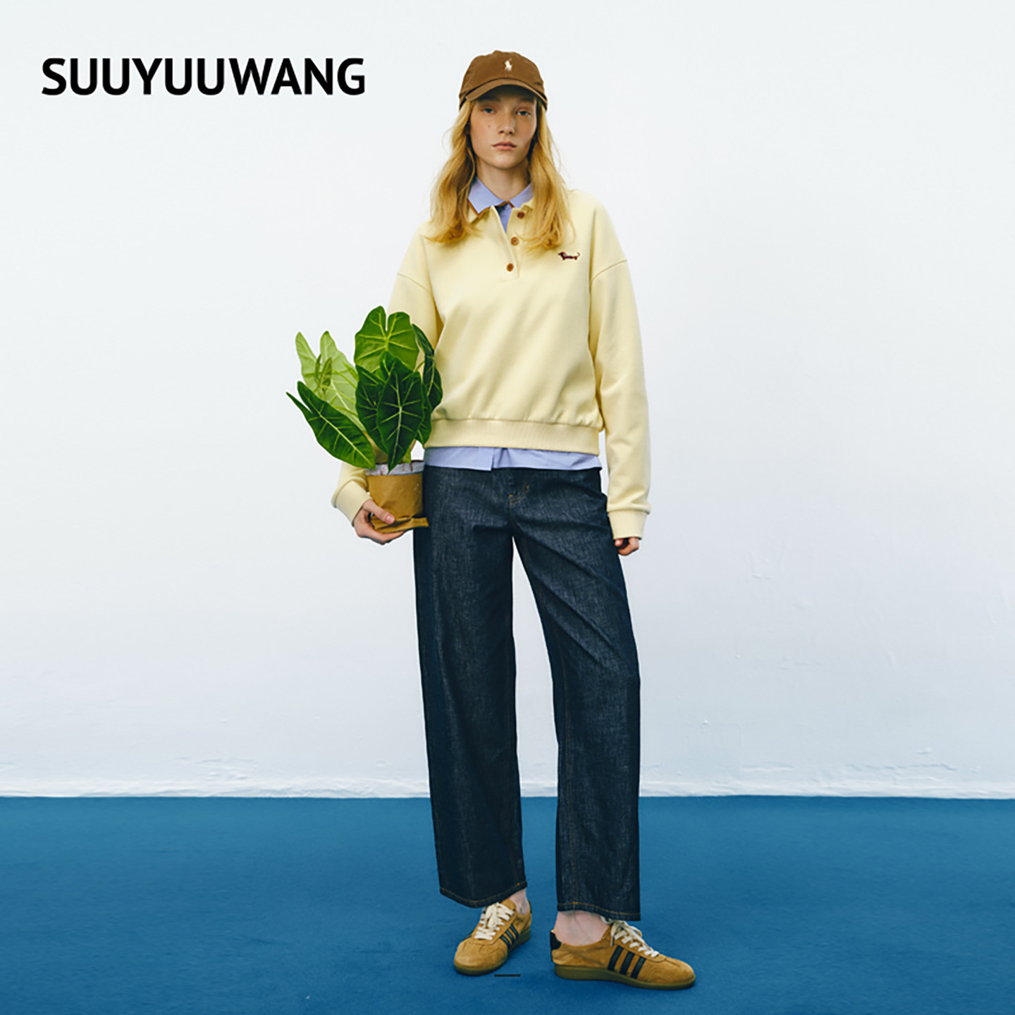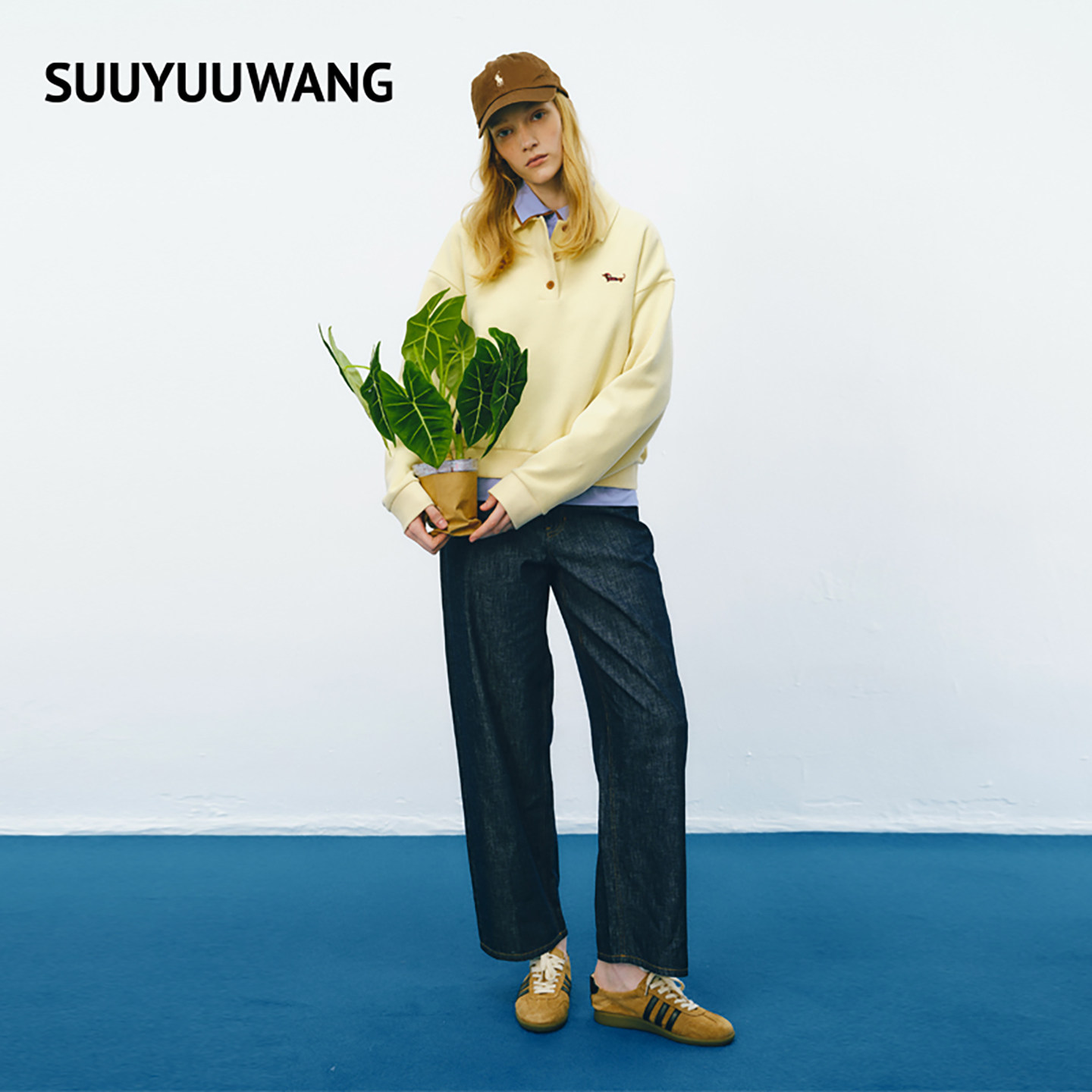 【明星同款】SUUYUUWANG26春新品翻领撞色纽扣腊肠狗刺绣休闲卫衣