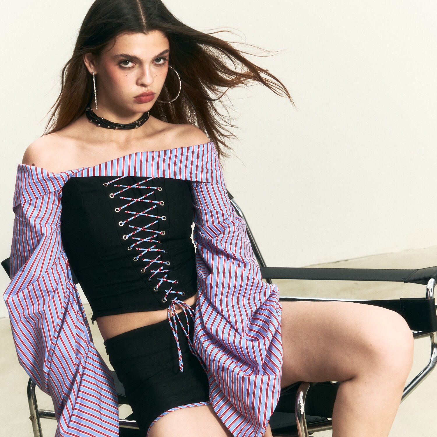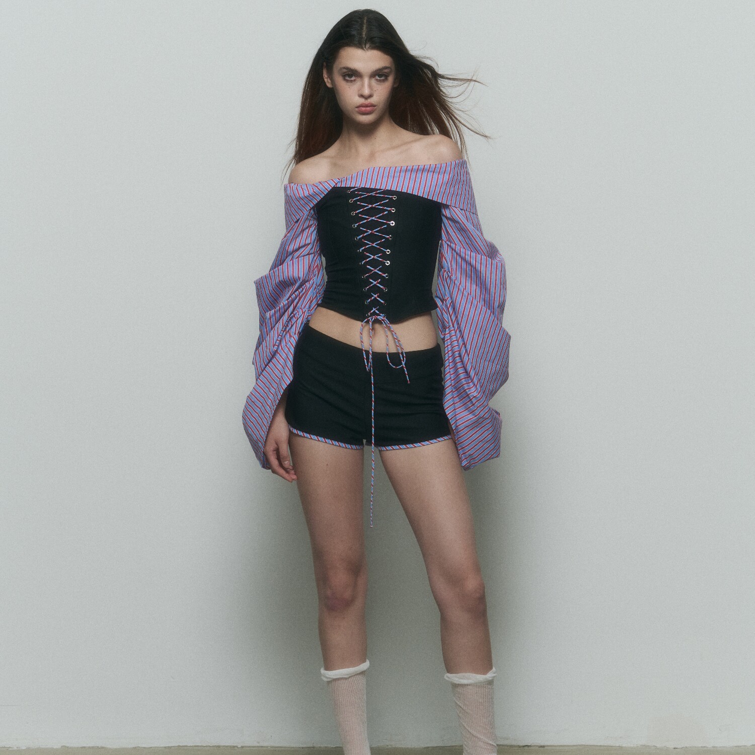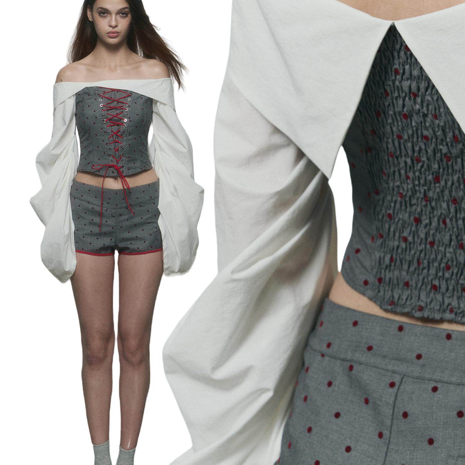 10AM 明星同款一字肩绑带上衣泡泡袖拼接衬衫女设计感修身套装