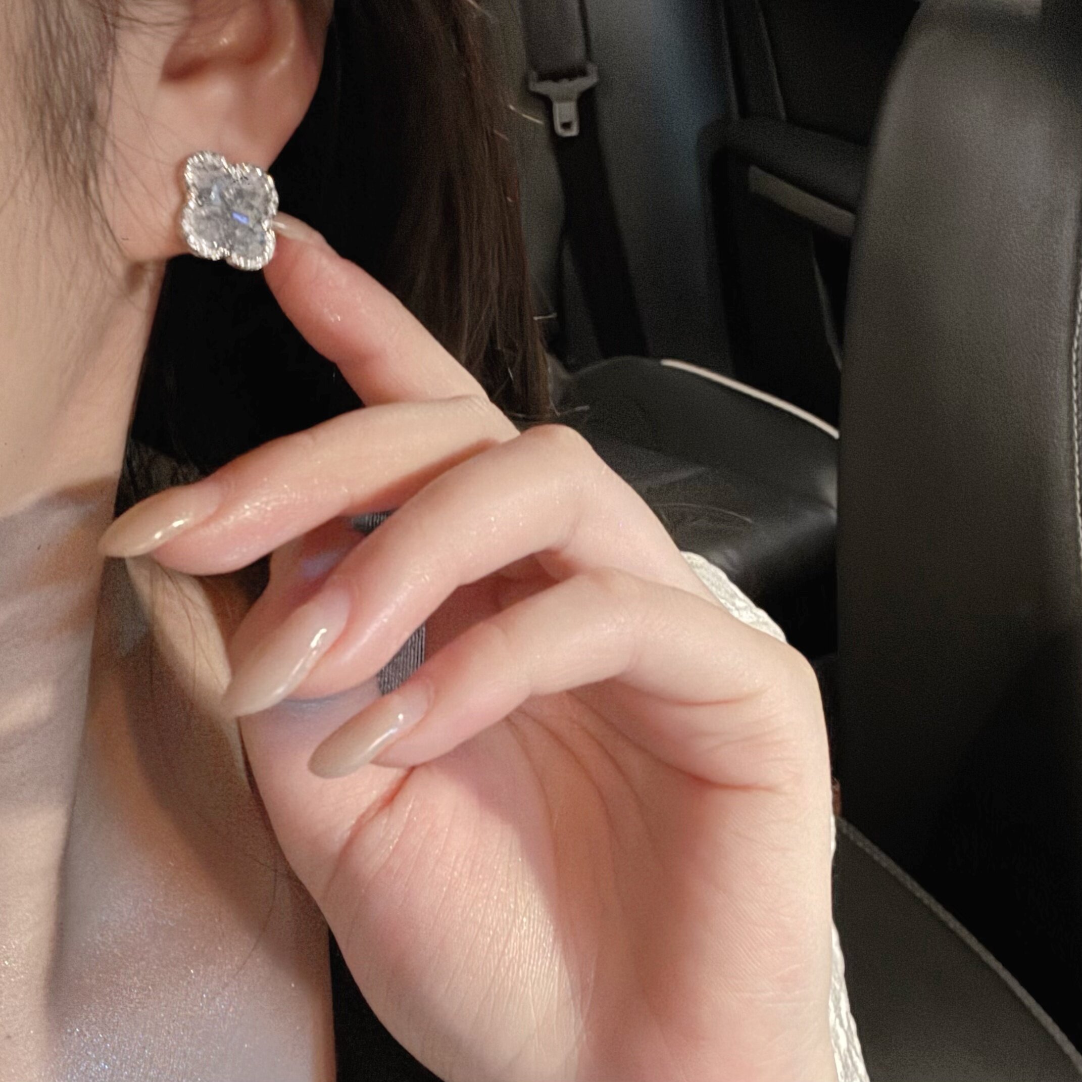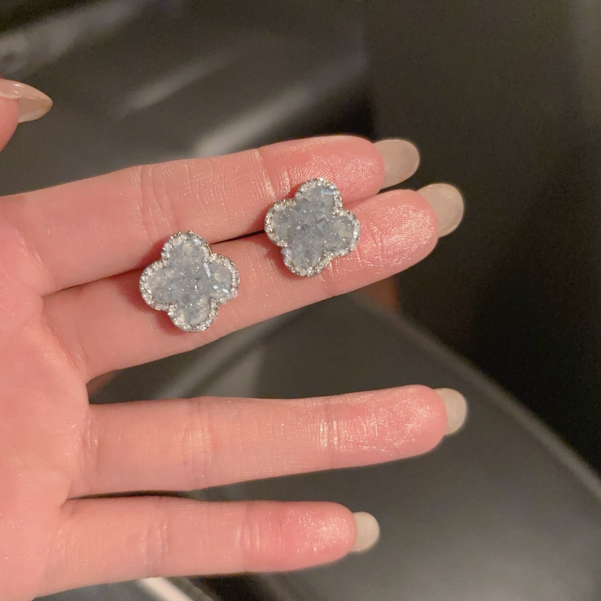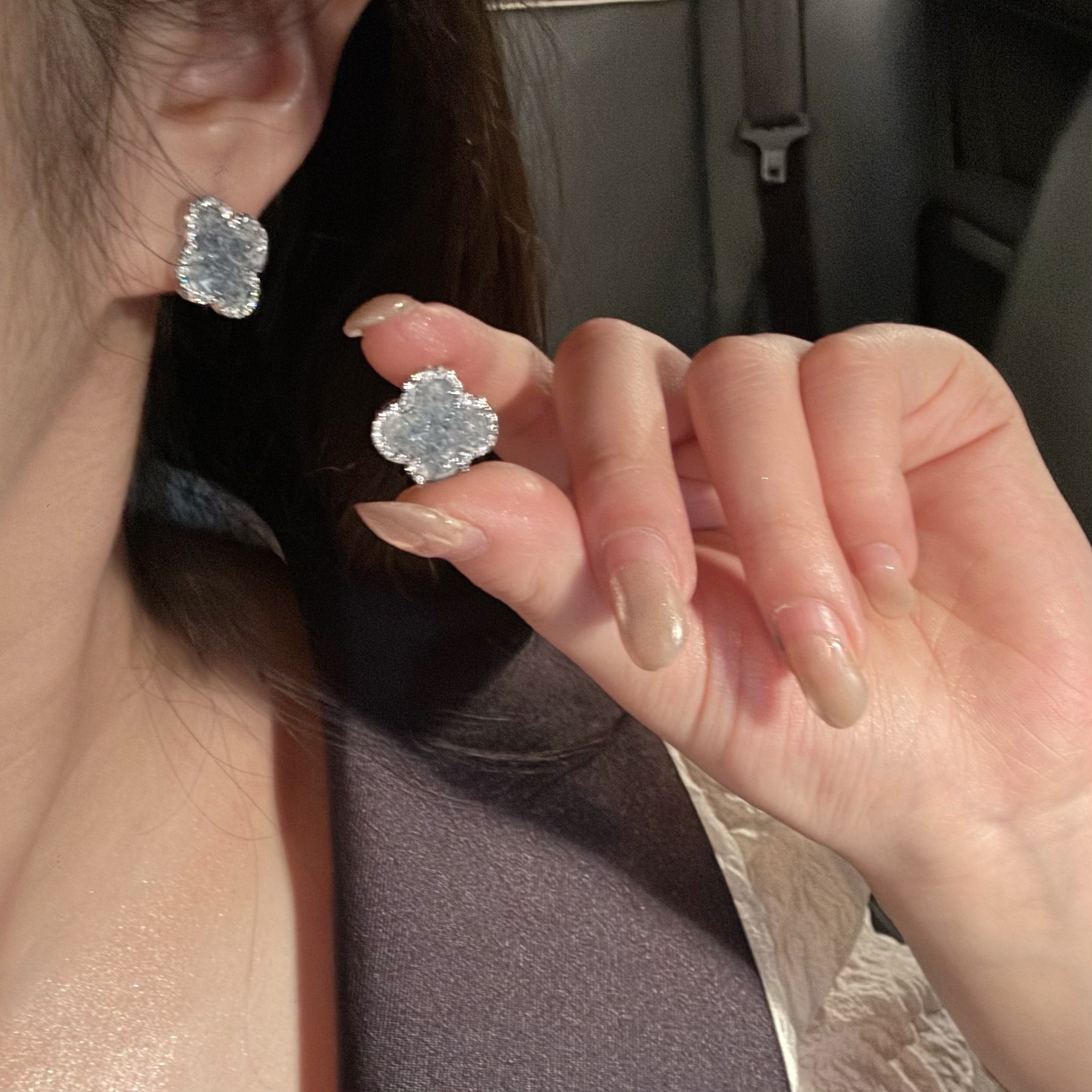 蓝色四叶花耳钉女轻奢小众设计高级感气质耳环法式精致镶钻耳夹