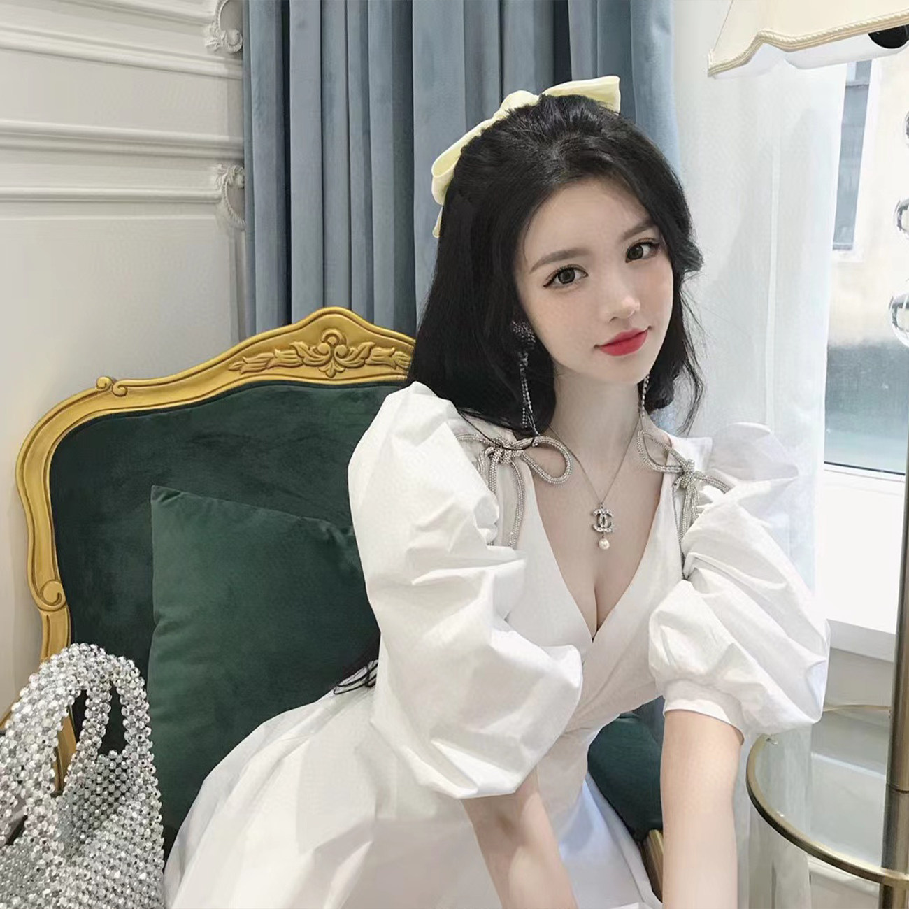 Maison Wester夏季新品绑结年轻连衣裙显瘦性感V领时尚名媛礼服