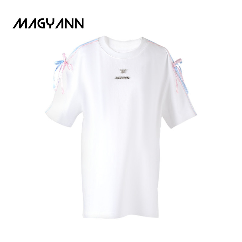 【粉蓝格】Magyann设计师原创2026夏休闲圆领蝴蝶结系带T恤短袖女
