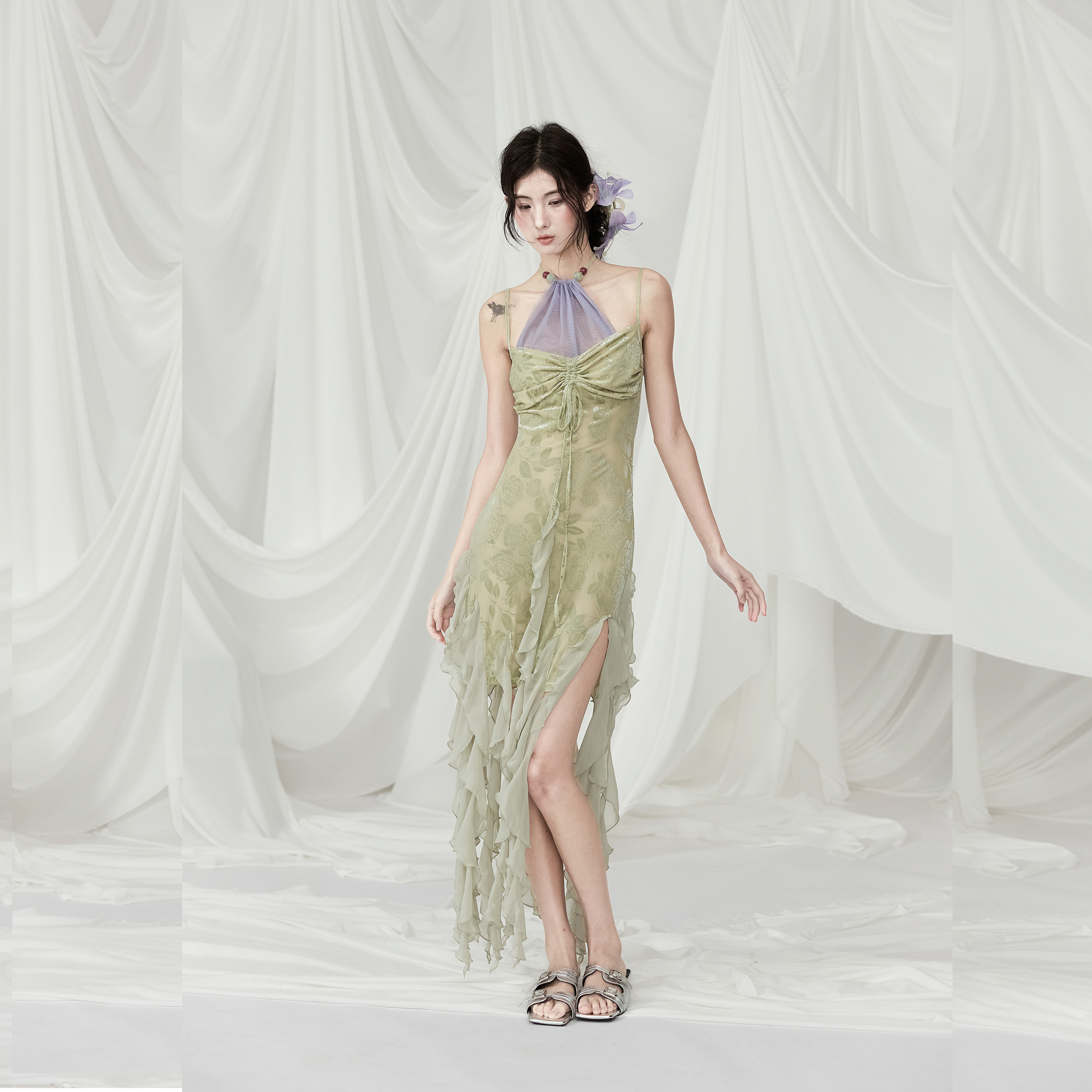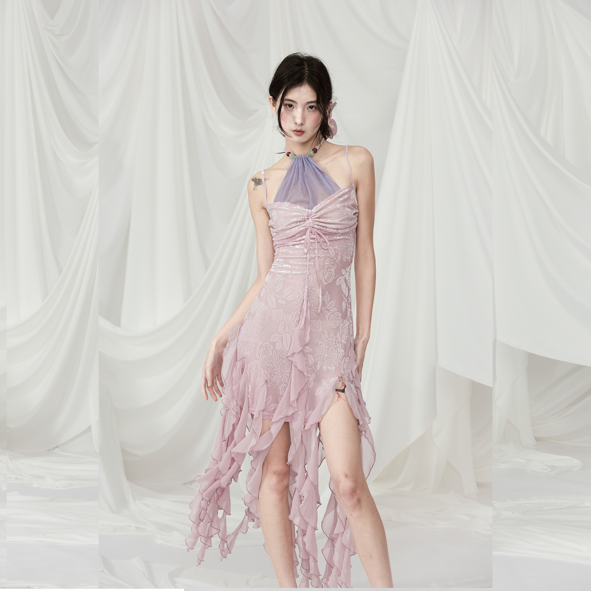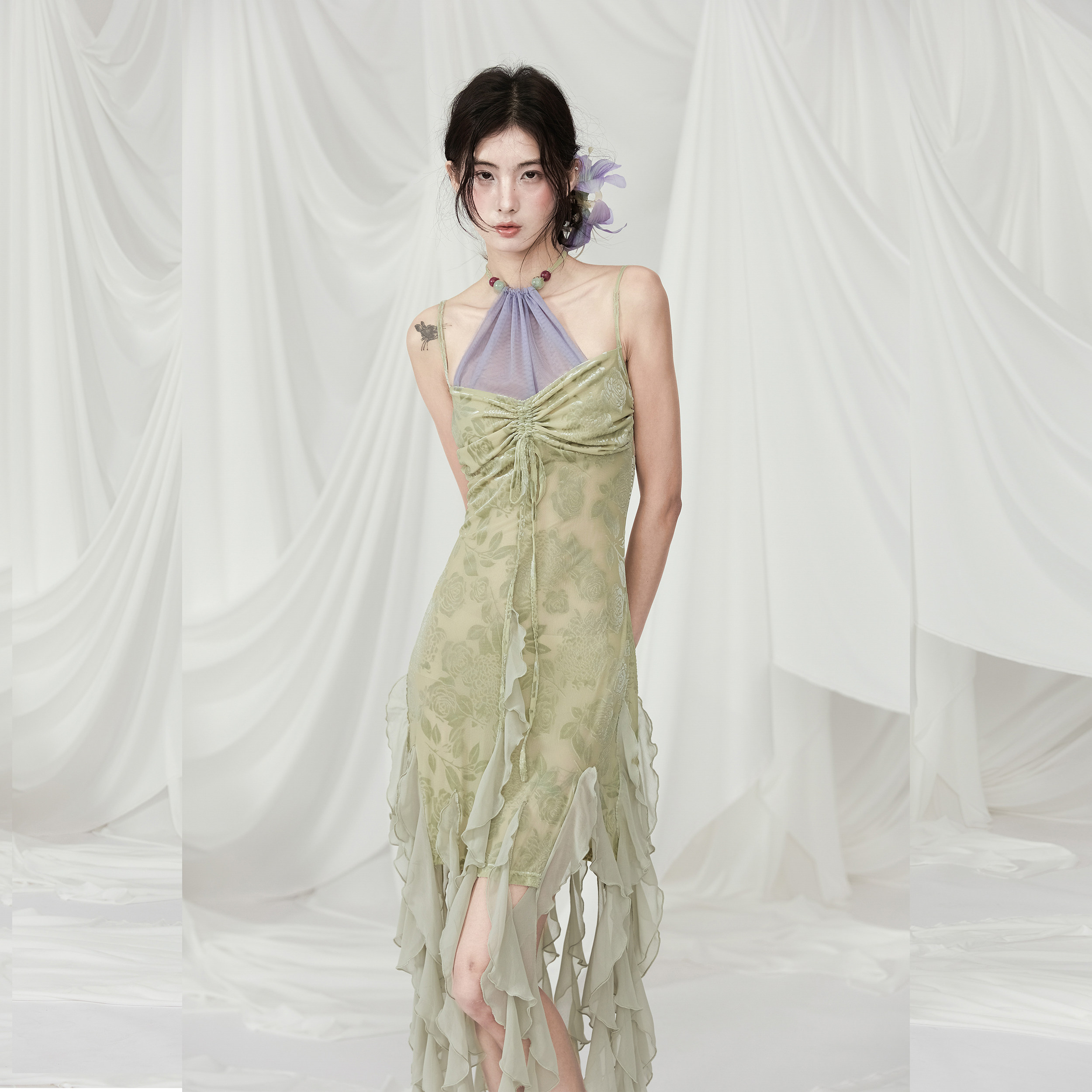 MildRate原创 “浮绒翩丝”荷叶边飘片植绒烧花挂脖吊带连衣裙