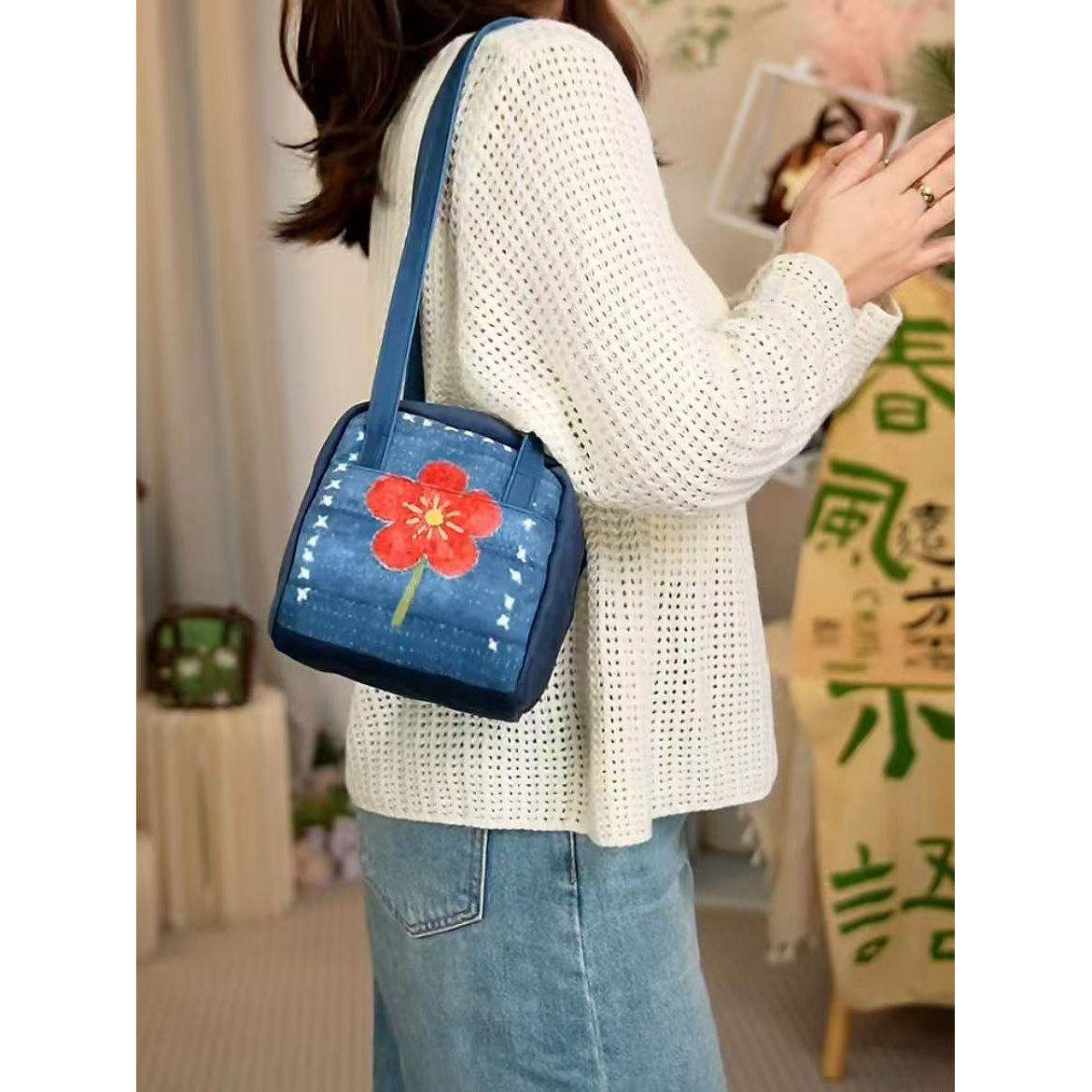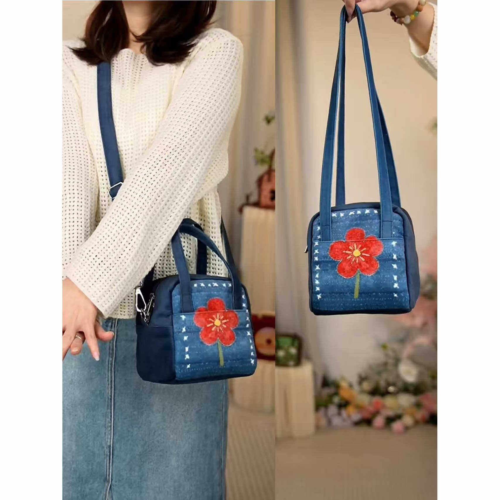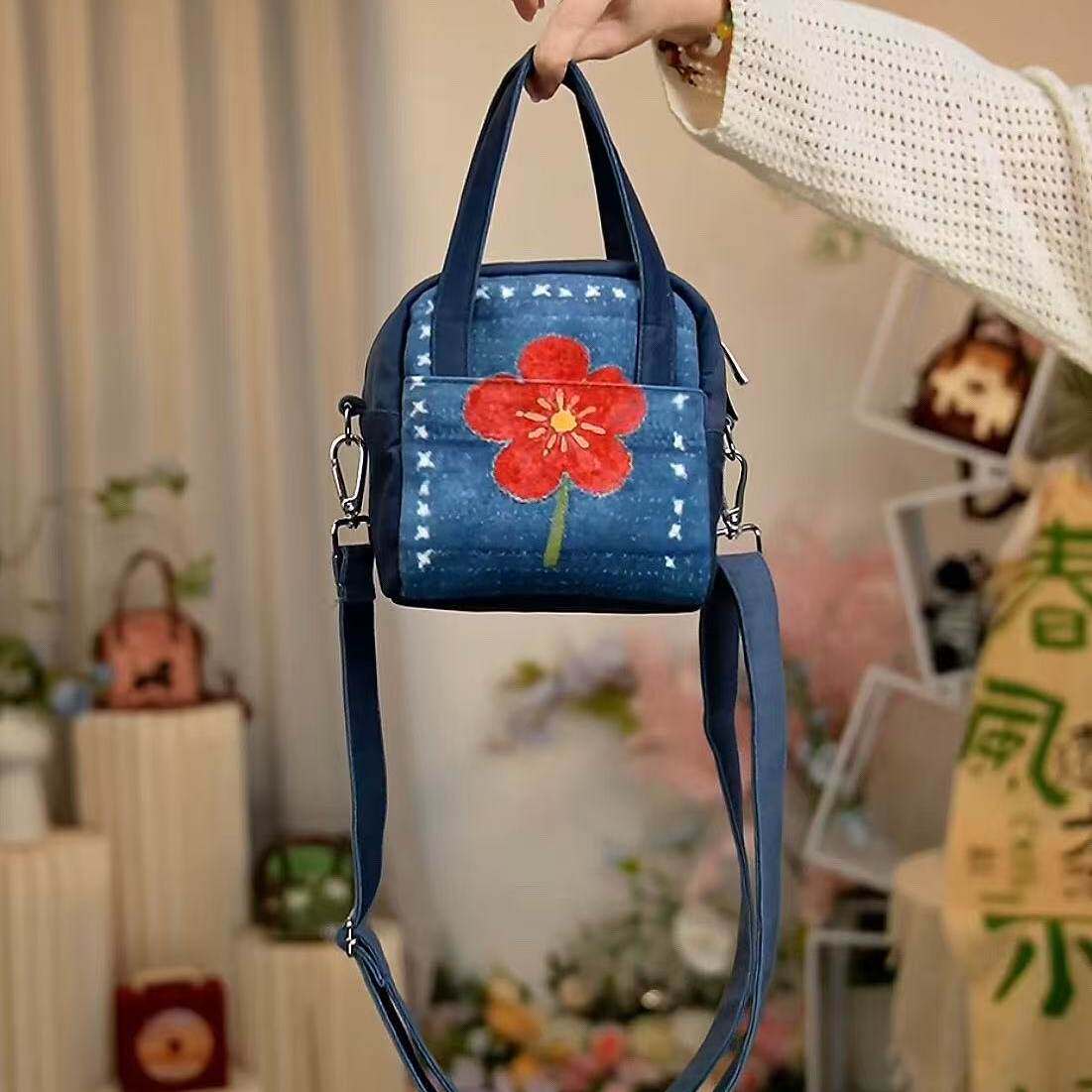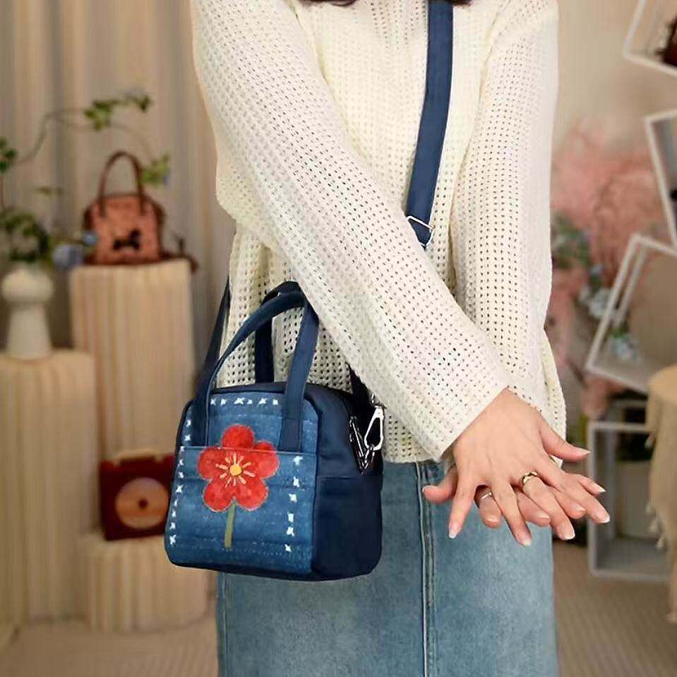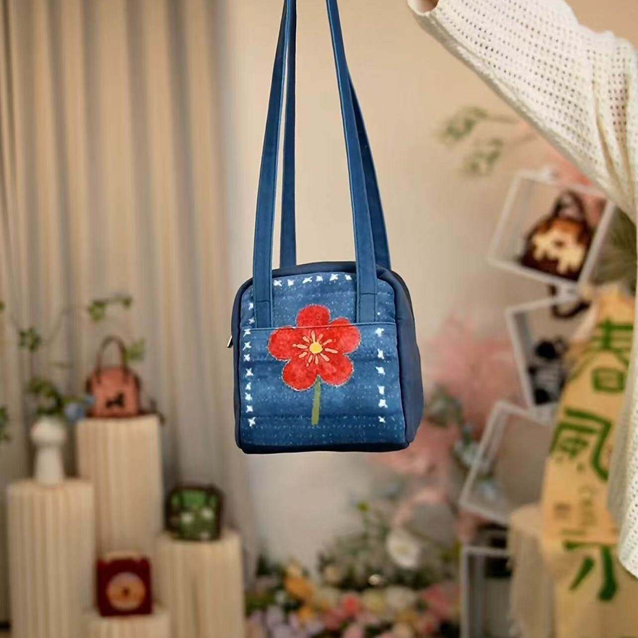 日本代购GP靛蓝花事斜挎方糖包印花卡通水桶包女单肩斜挎包百搭