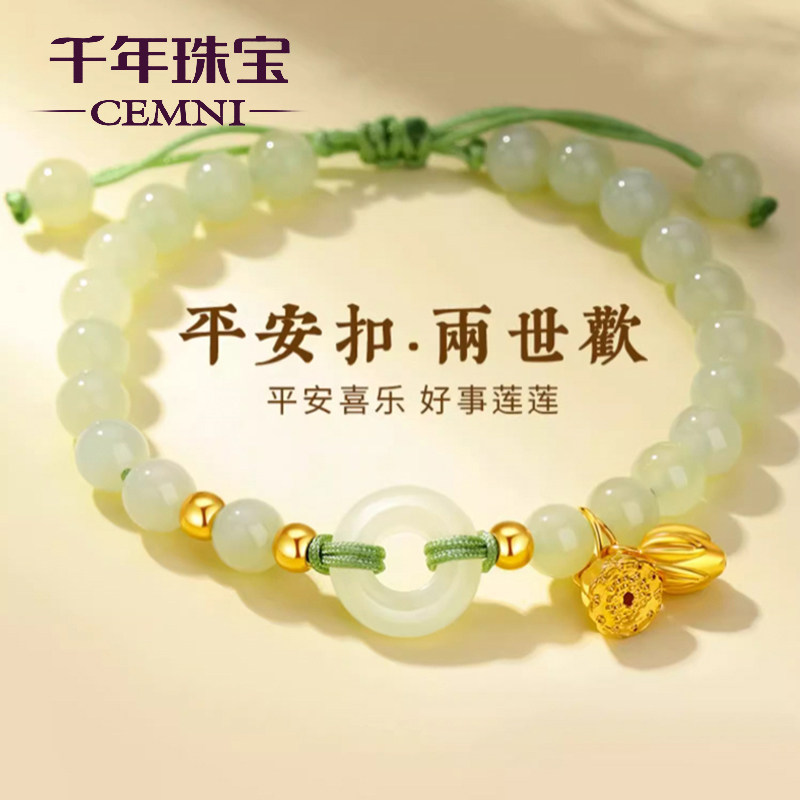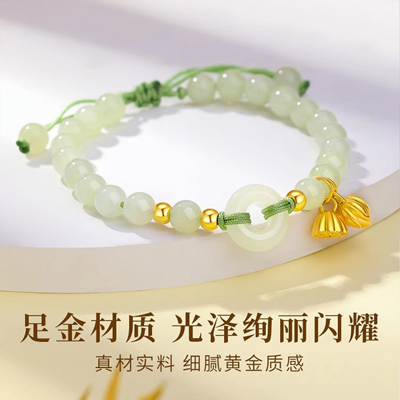 千年珠宝足金999手链女两世欢莲蓬手绳平安扣和田玉新款送礼