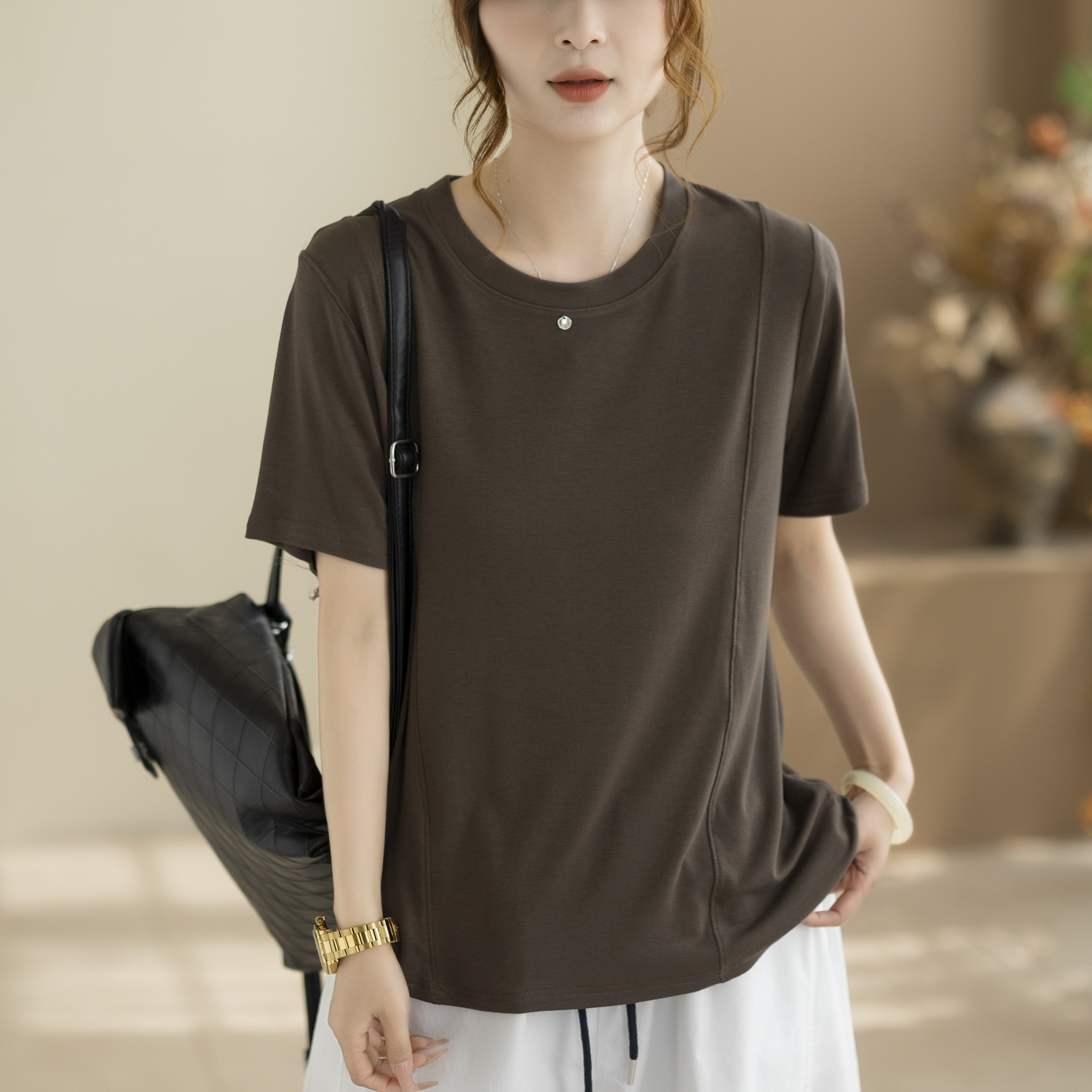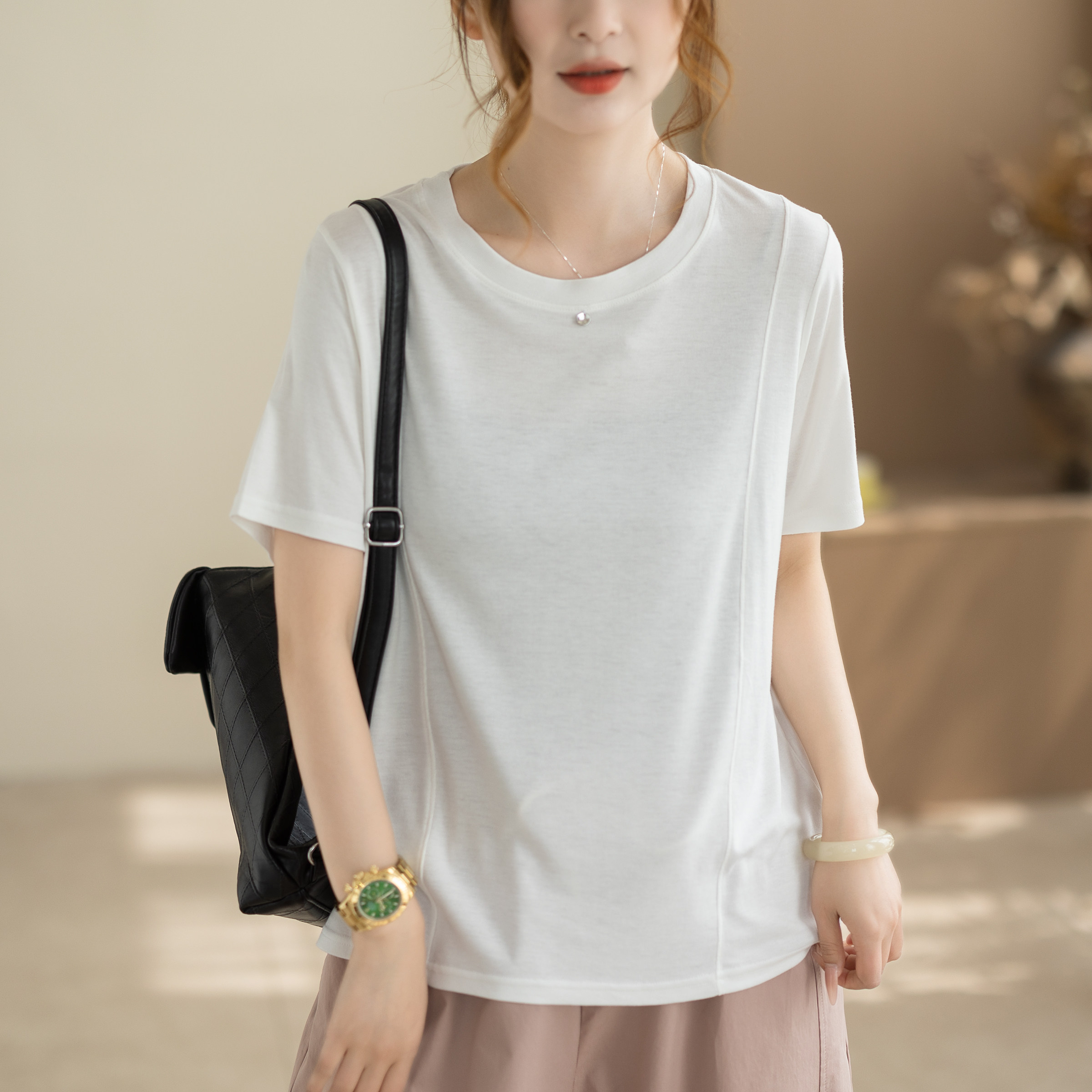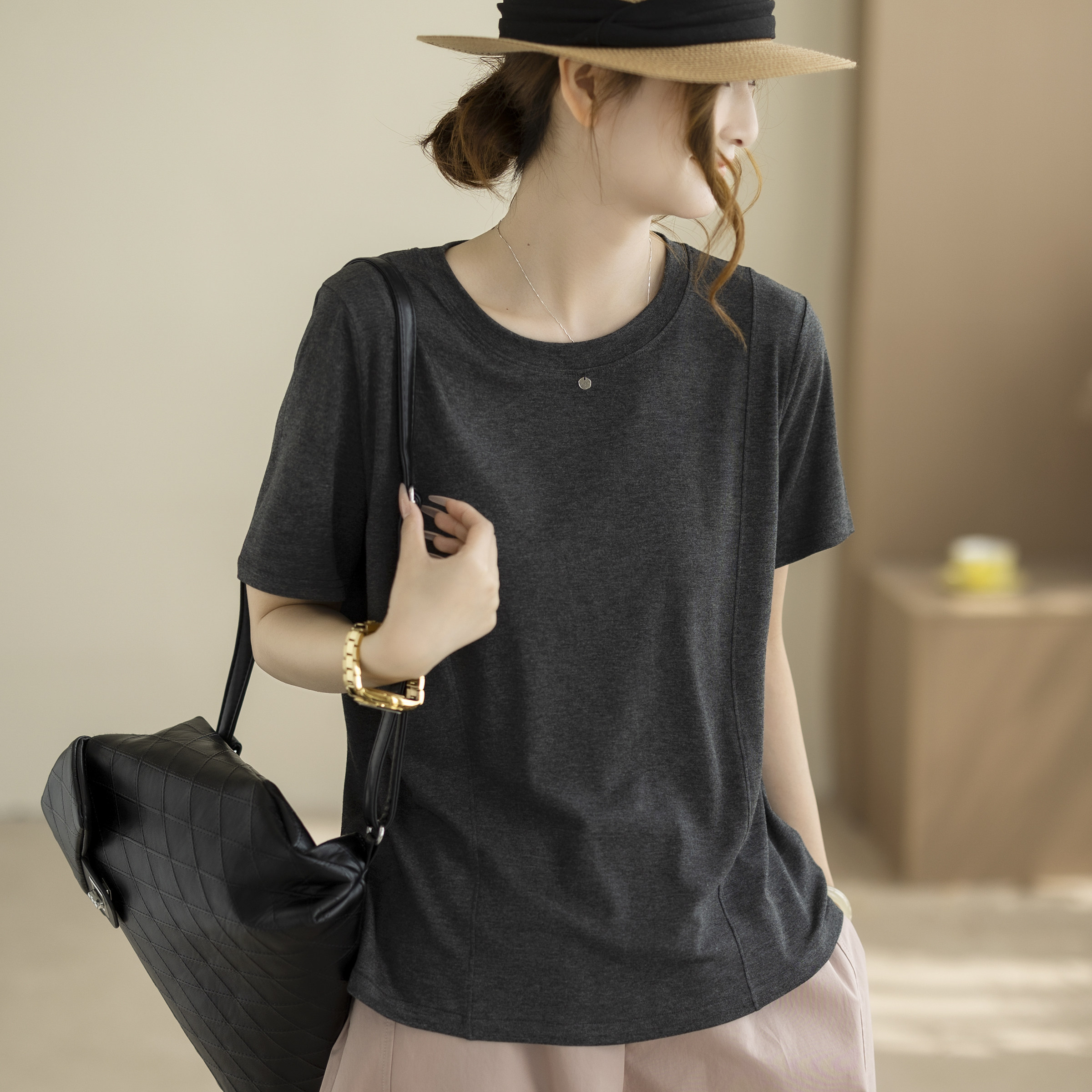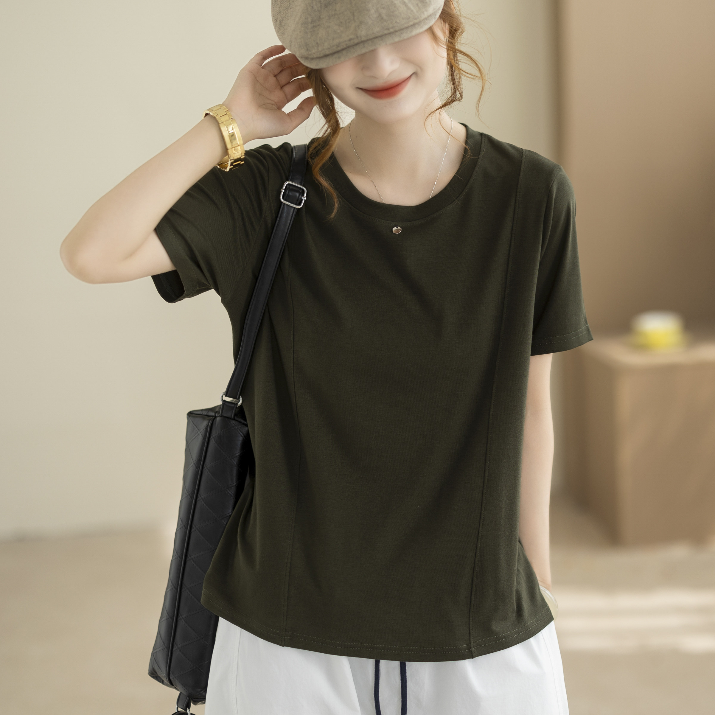 咖咪羽简约圆领T恤女 夏季新款宽松显瘦百搭休闲纯色短袖女装上衣